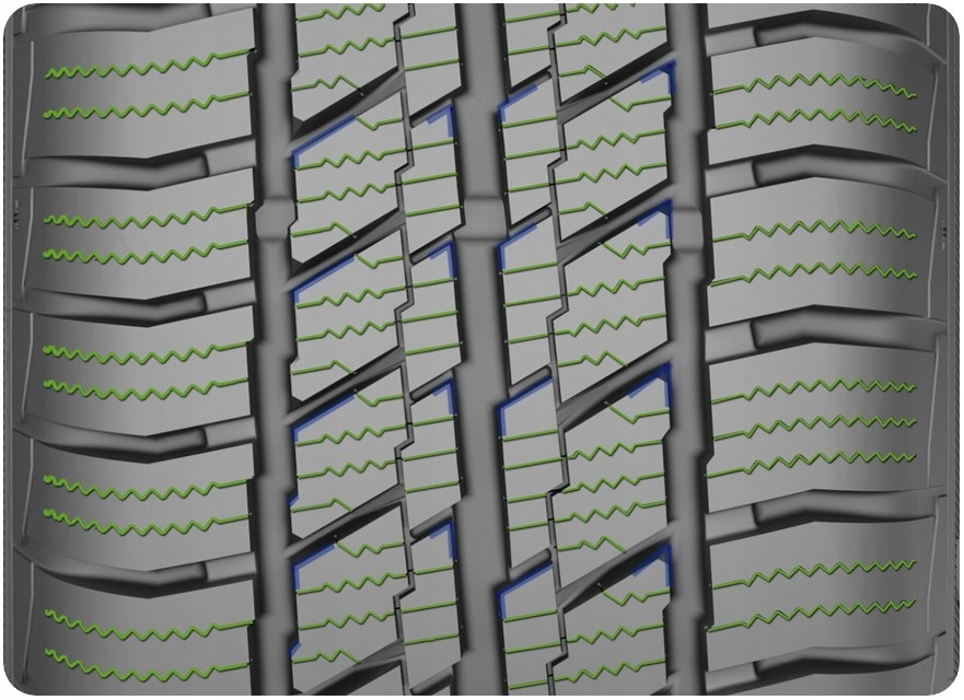 - Широкие окружные и боковые канавки обеспечивают устойчивость к аквапланированию