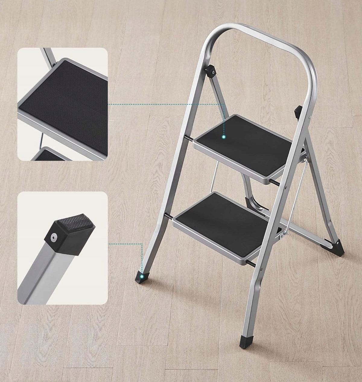 ✅Поверхность ступенек лестницы оснащена нескользящими ребрами, обеспечивающими безопасную и прочную опору. Ножки лестницы имеют резиновые стопоры для защиты пола от царапин и обеспечения дополнительной устойчивости.
