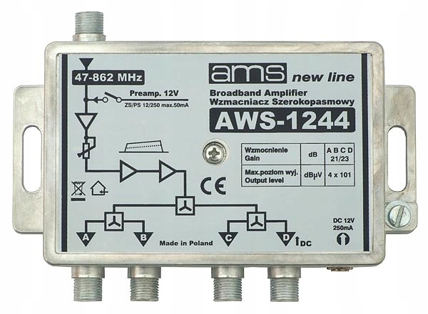 Усилитель AWS-1244 предназначен для работы в индивидуальных и коллективных антенных установках RTV. В случае индивидуальной установки антенны необходимо подключать с помощью диплексера. Усилитель имеет возможность питания предусилителей напряжением 12 В. Для этого переместите перемычку согласно инструкции, входящей в комплект.
