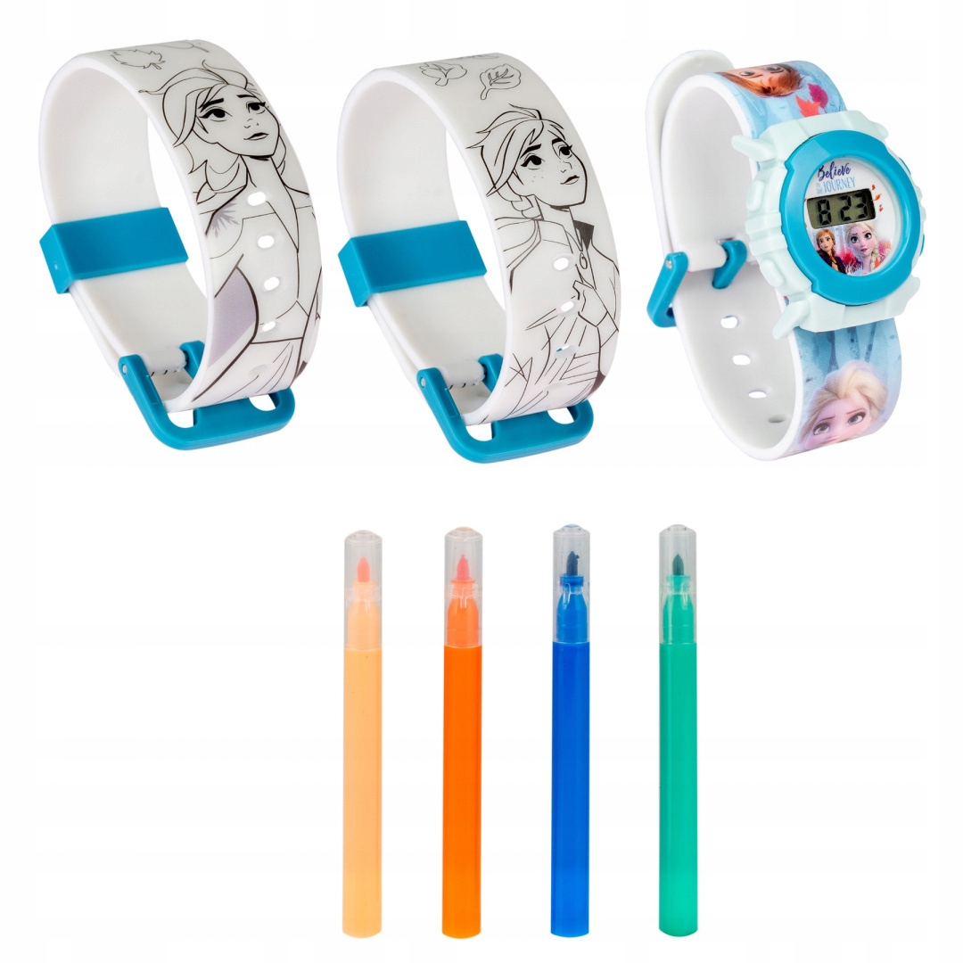 - Набор включает в себя часы, четыре красочных маркера и три полосы.