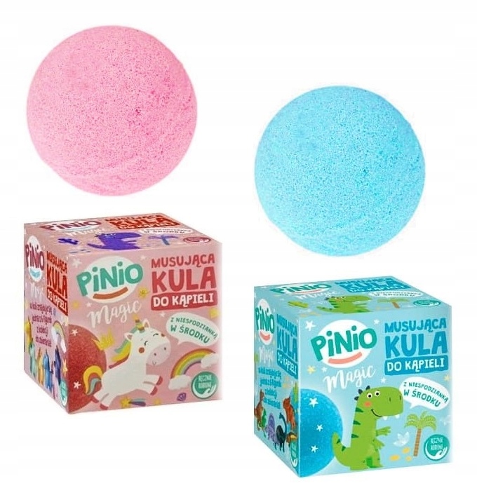 Шипучая бомбочка для ванны PINIO MAGIC с сюрпризом. Шипучая бомбочка для ванны с одной из 6 фигурок из коллекционной коллекции. При броске в ванну розовый шарик окрашивает воду в розовый, а синий шарик окрашивает воду в синий. > и источает сладкий аромат.