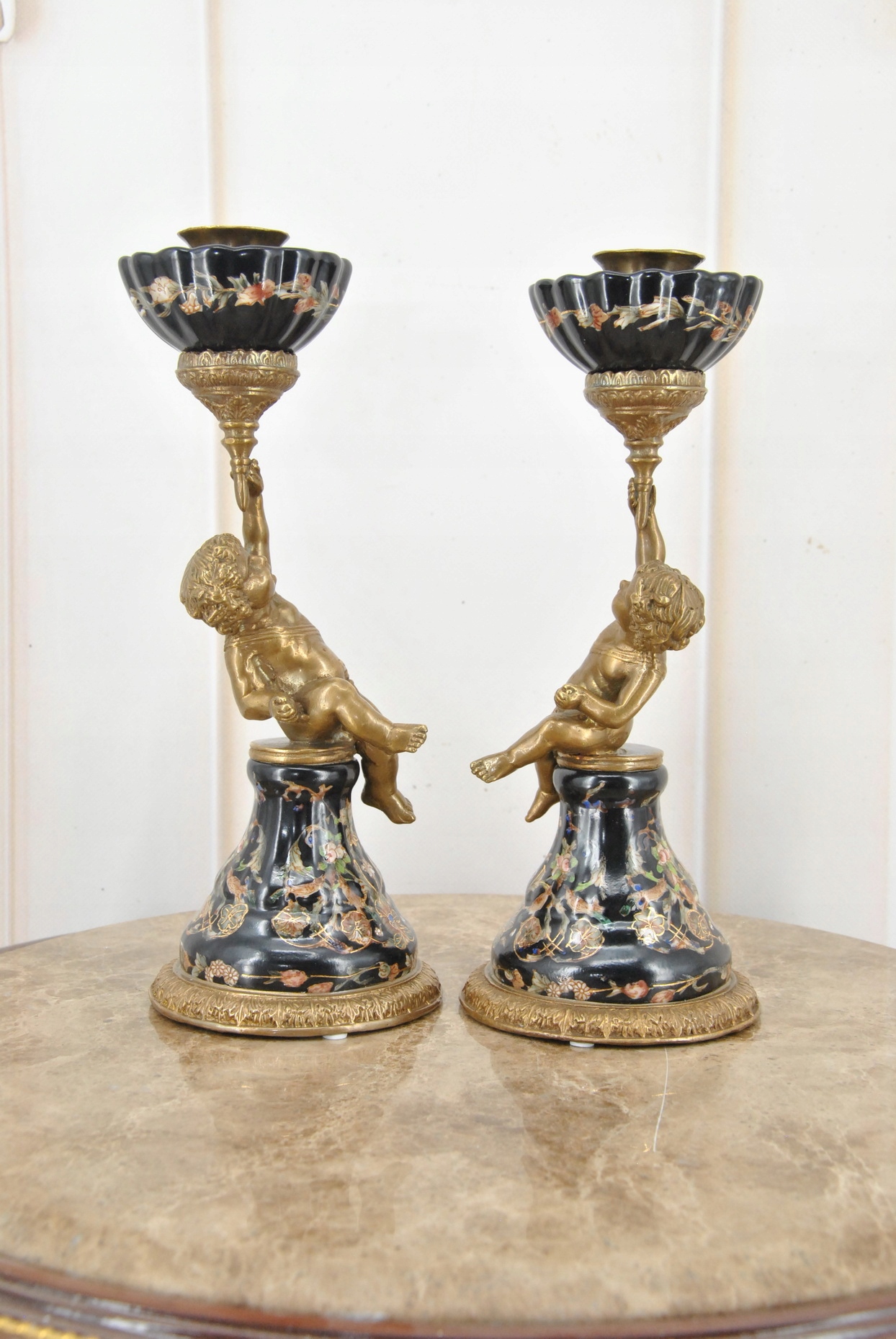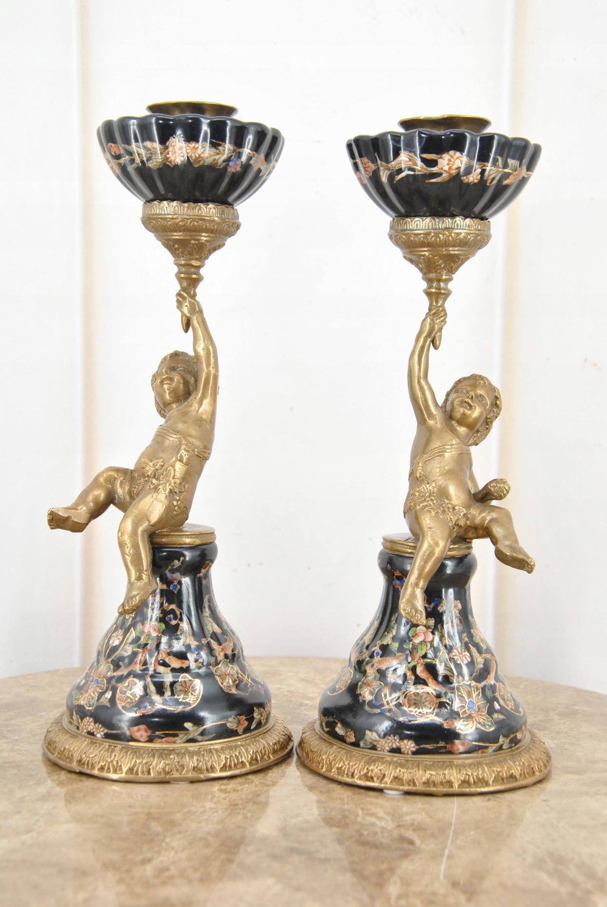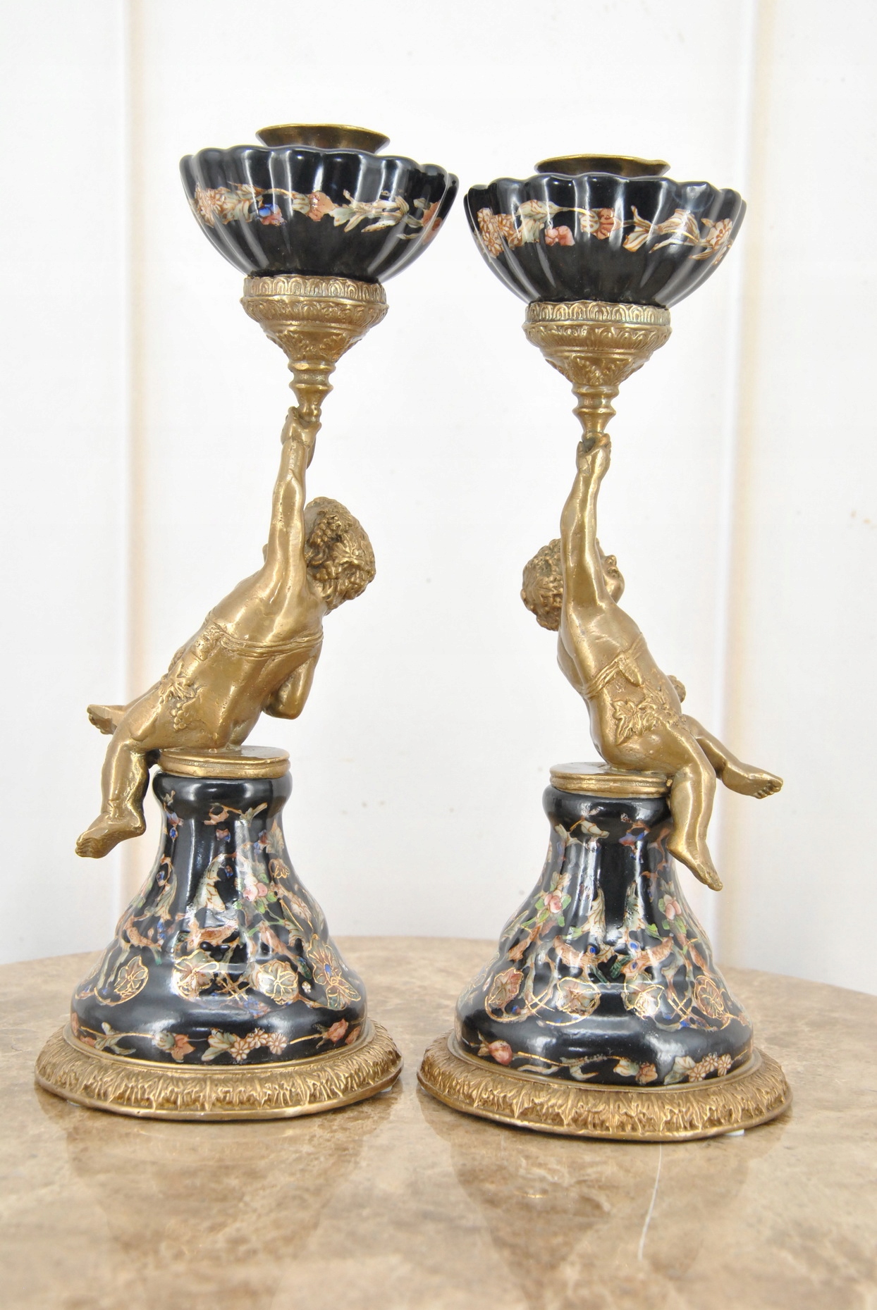 2 x фарфоровые подсвечники Ангелы - Ангел Амор - Черный фарфор + бронза