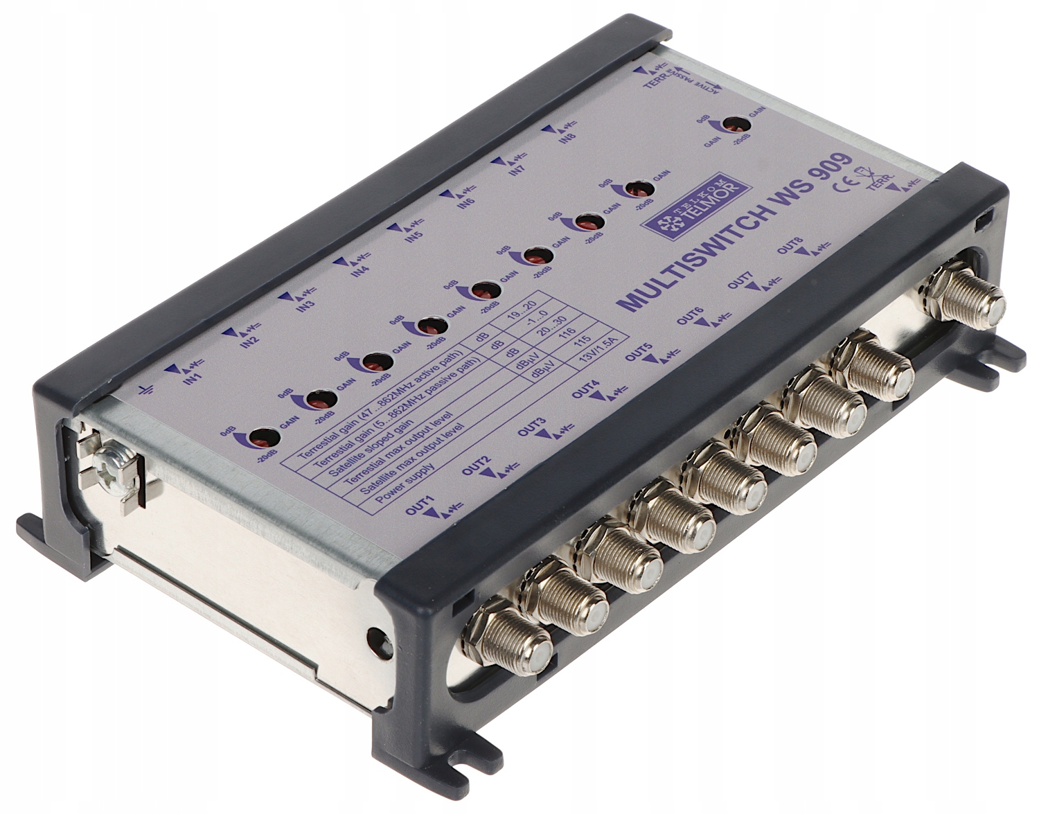 WS-909 — это усилитель, предназначенный для 9-полосных мультисвичных установок (HotBird + ASTRA). Устройство используется для усиления сигнала мультисвитч-шины при большом количестве мультисвичей или очень больших расстояниях между мультисвитчами или мультисвичем и спутниковой антенной. Усилитель имеет встроенную коррекцию характеристики кабеля (наклон характеристики 10 дБ). Преимуществом WS-909 является очень высокий максимальный выходной уровень сигнала усилителя как на спутниковых, так и наземных телеканалах. Это позволяет устанавливать усилитель на небольших расстояниях от спутниковой антенны, без риска перегрузки