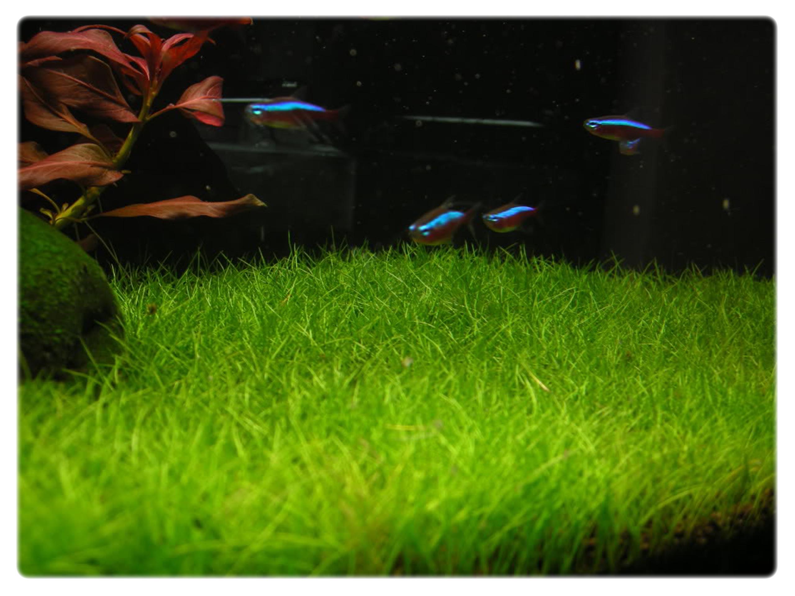 После посадки растения оставьте уровень воды неизменным, т.е. до верхнего слоя субстрата, и поддерживайте повышенную влажность внутри емкости. Для этого заклейте верх, например, кусочком бесцветной стретч-фольги. Подготовленный таким образом аквариум оставьте в прохладном месте (18-23 градуса С) и освещайте его по 8-10 часов каждый день. Через 2 месяца терпеливого ожидания у вас будет красивый и компактный газон, который не сможет вскопать ни одна кираса и который станет предметом зависти многих аквариумистов.