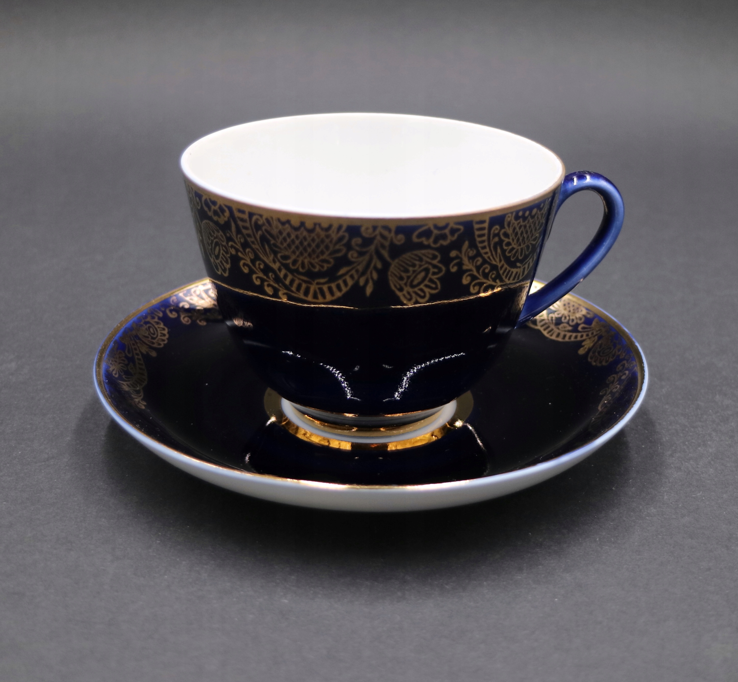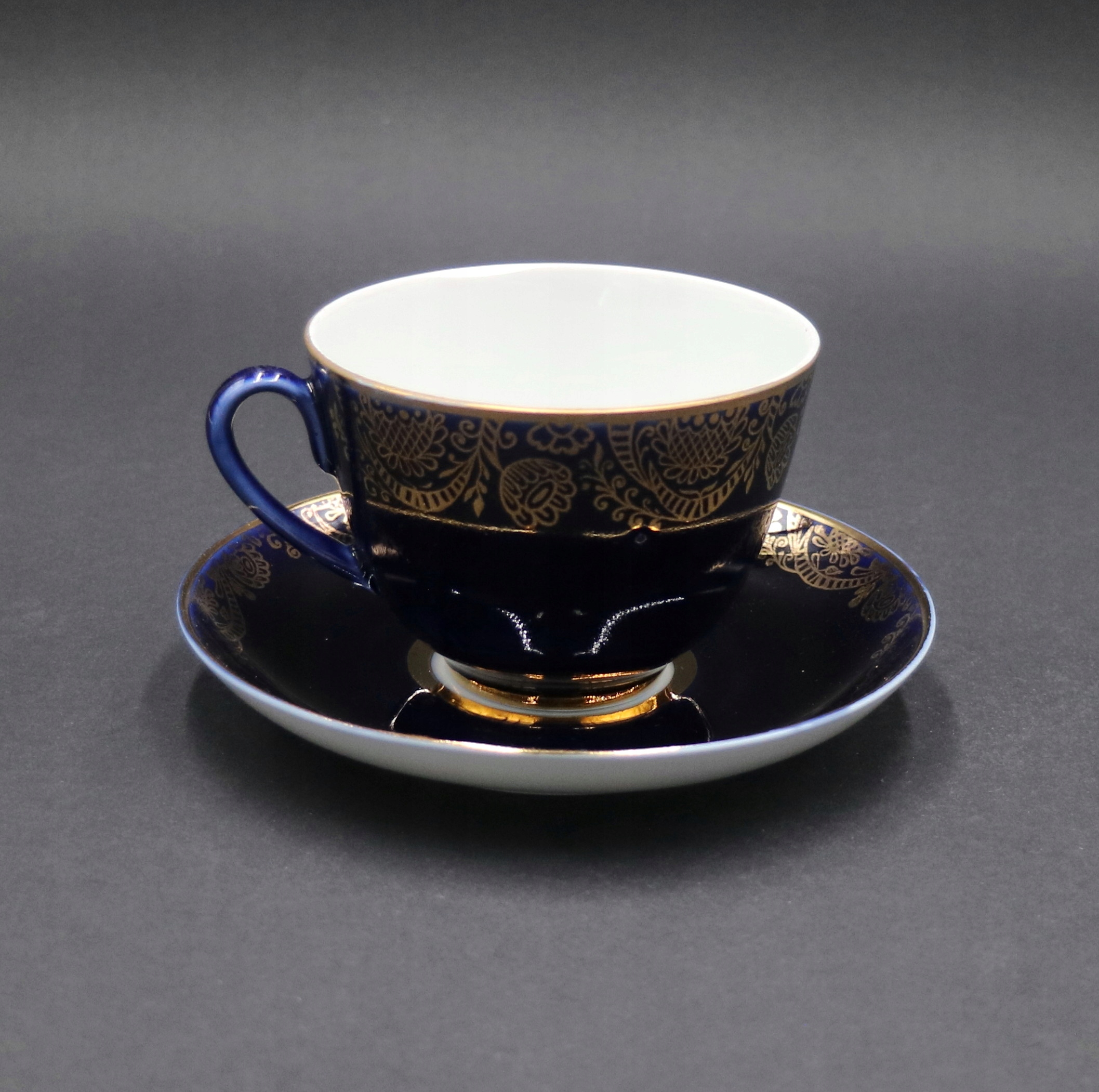 .Белый фарфор, украшенный кобальтом и позолочкой.