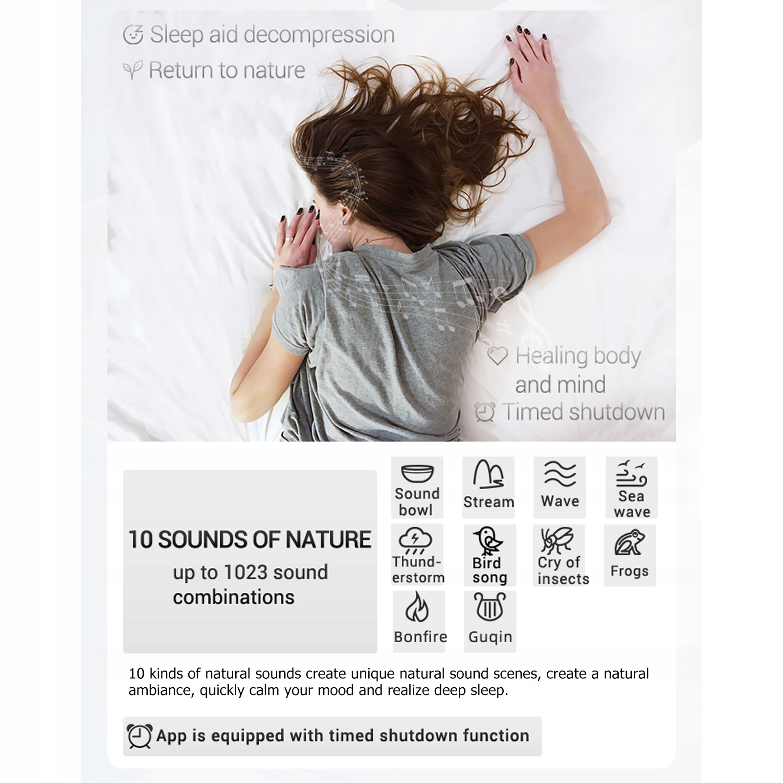 2. Выбор 10 тонов: 10 видов звуков создают уникальные естественные звуковые сцены, создают тихую атмосферу, быстро успокаивают настроение и обеспечивают глубокий сон.