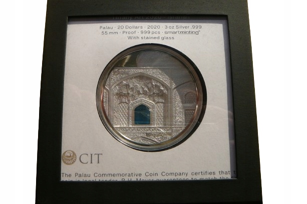 ВЫСТАВЛЕНА НА АУКЦИОН КРАСИВАЯ ОРИГИНАЛЬНАЯ И РЕДКАЯ КОЛЛЕКЦИОННАЯ СЕРЕБРЯНАЯ МОНЕТА - 20 ДОЛЛАРОВ - ПАЛАУ 2020 - ИСФАХАН - ИСКУССТВО ТИФФАНИ - ЧИСТОЕ СЕРЕБРО 999 пробы - ВИТРАЖНОЕ СТЕКЛО - 3 УНЦИИ - МЯТА b > -