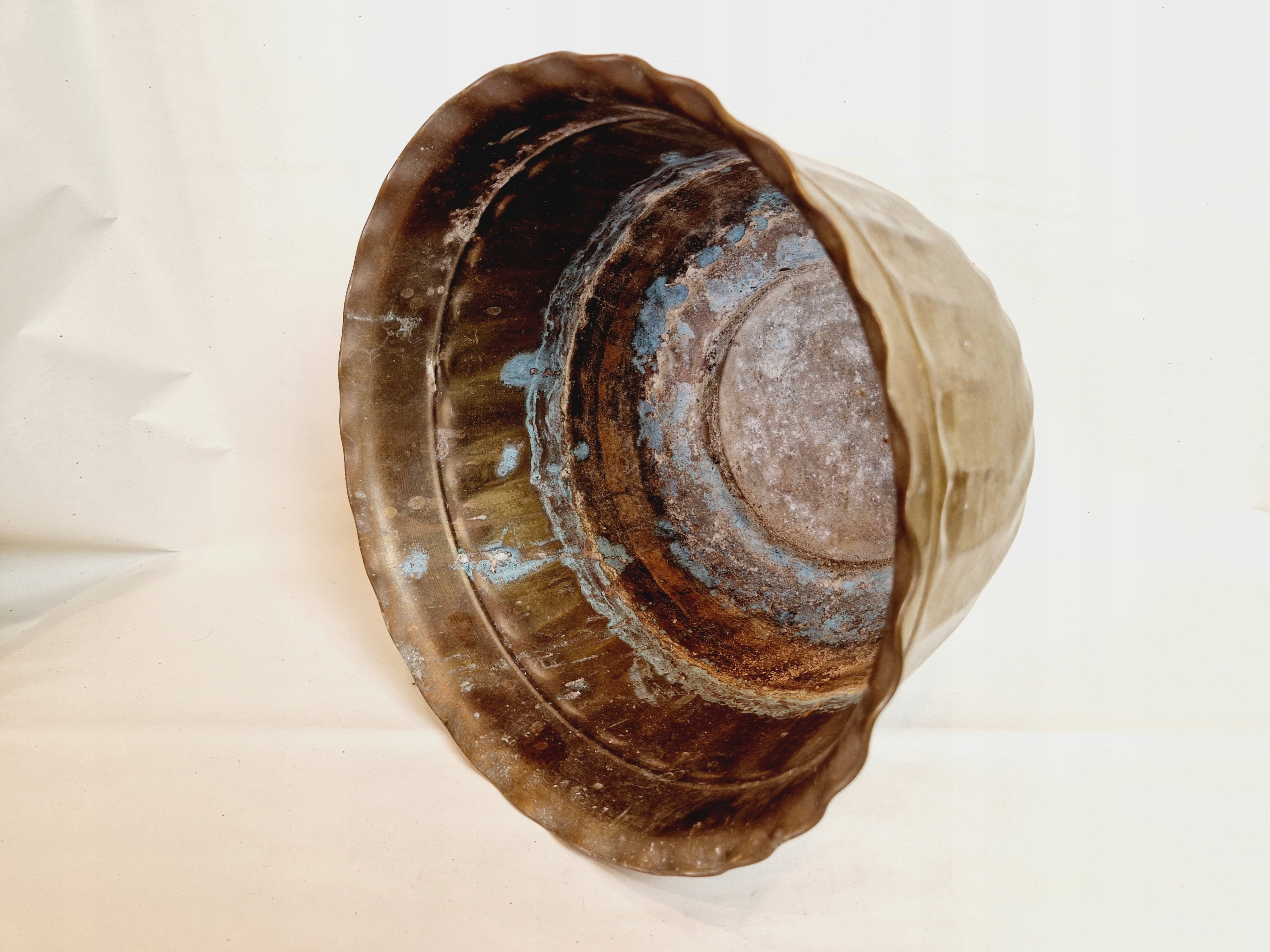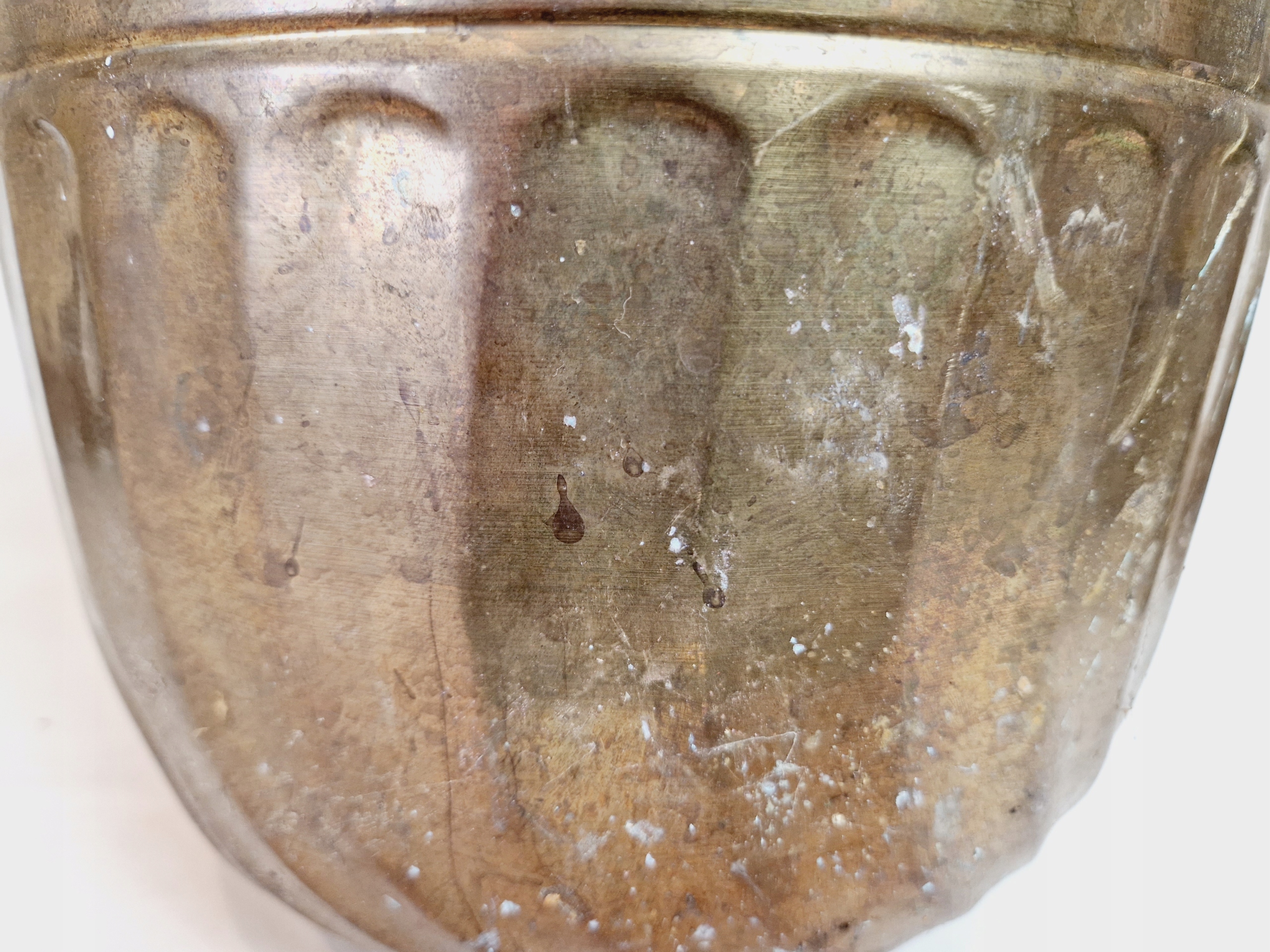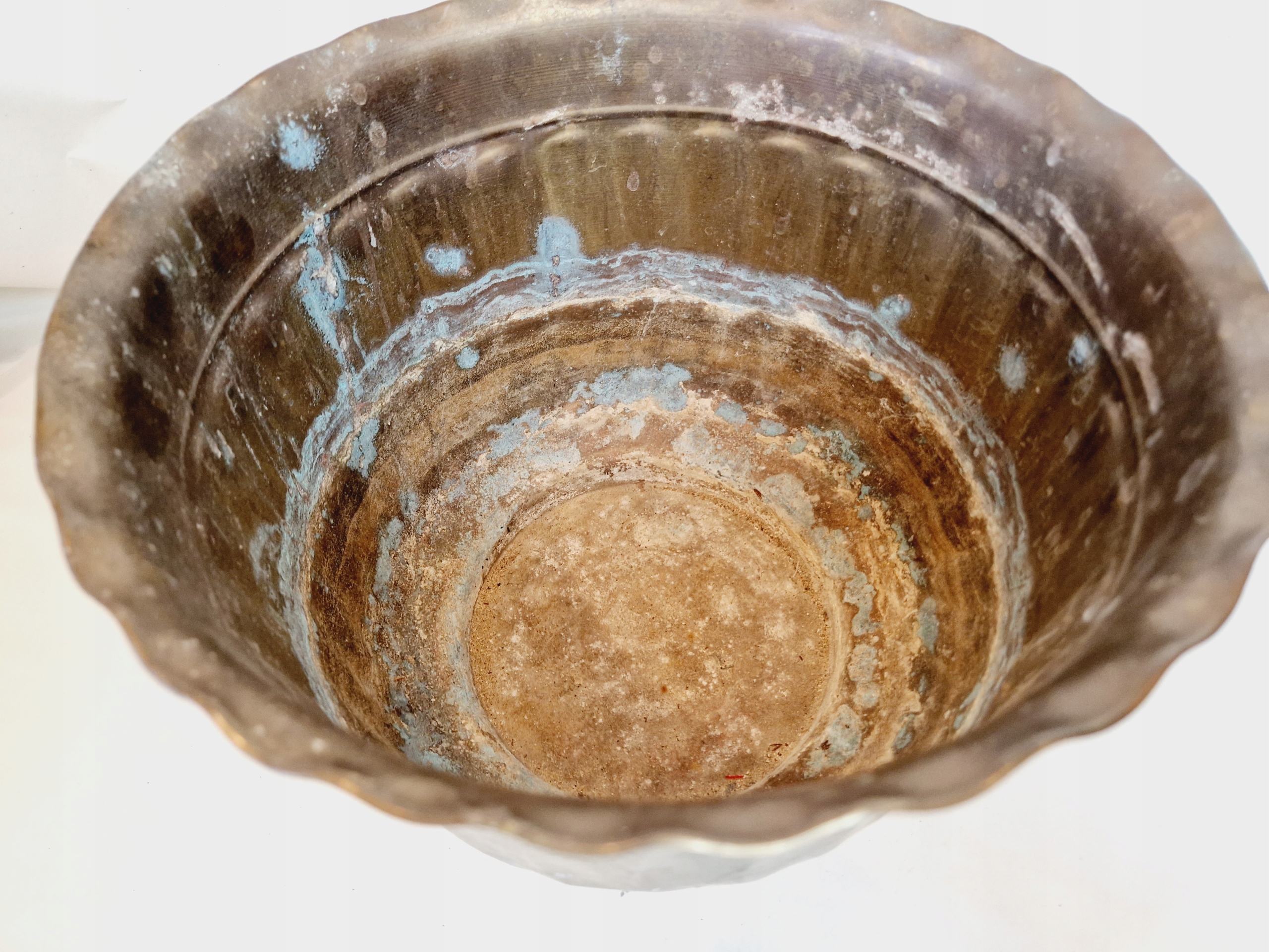 Внутренняя часть горшка покрыта камнем и ржавым налётом.
