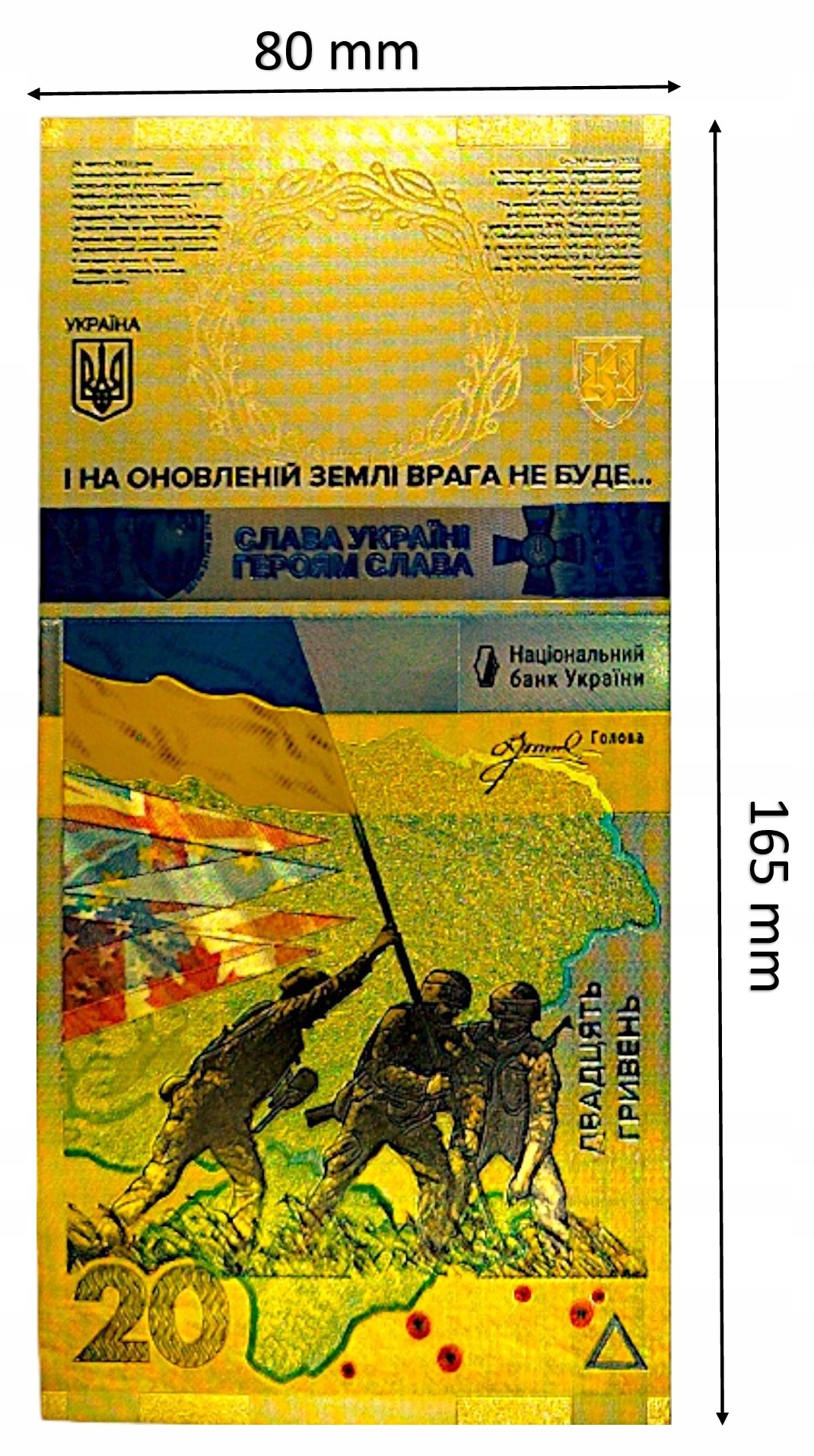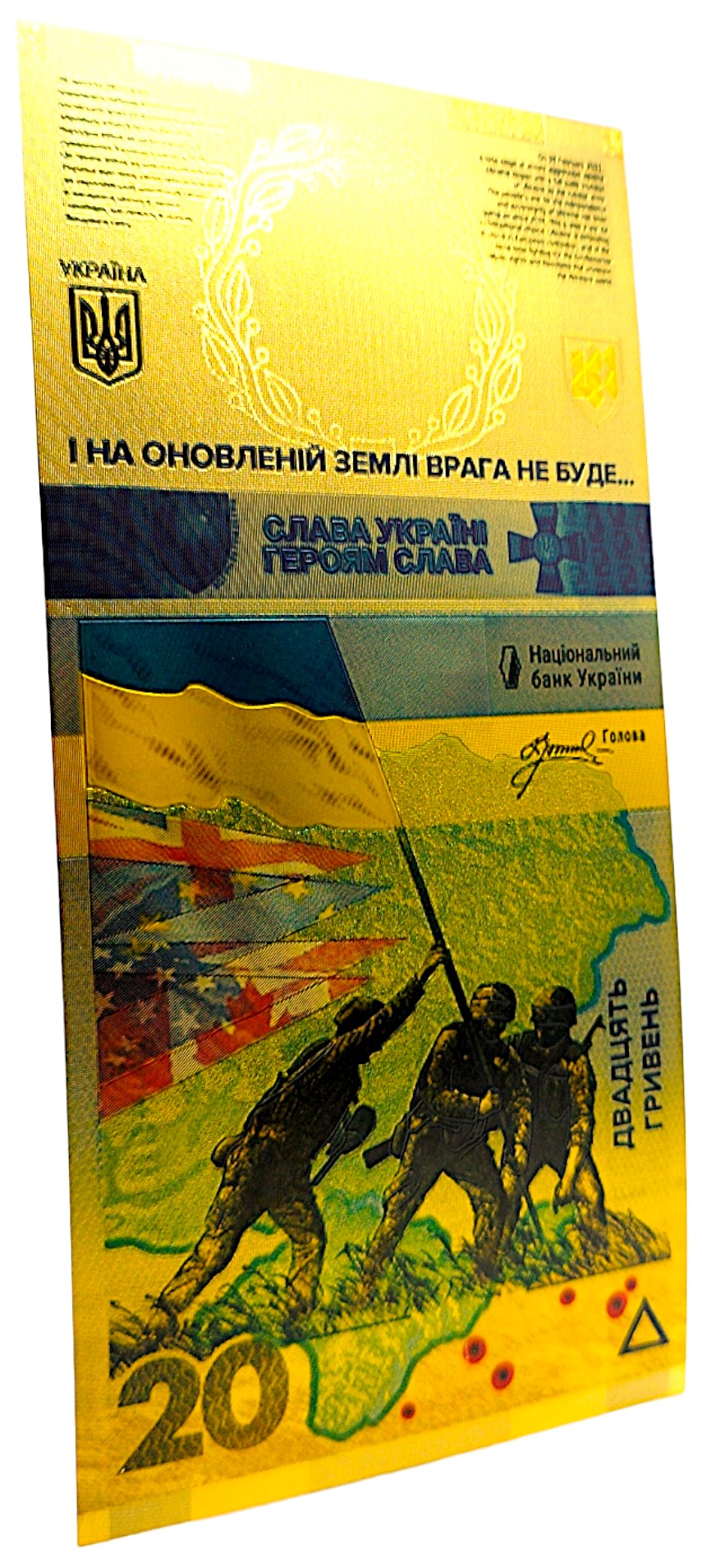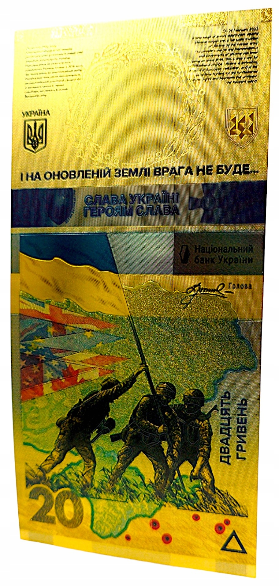 Банкнота номиналом двадцать гривен, введенная в обращение в 2023 году, увековечивает дух стойкости, героизма и силы духа, которые характеризуют украинский народ перед лицом противостояния с российскими агрессорами.