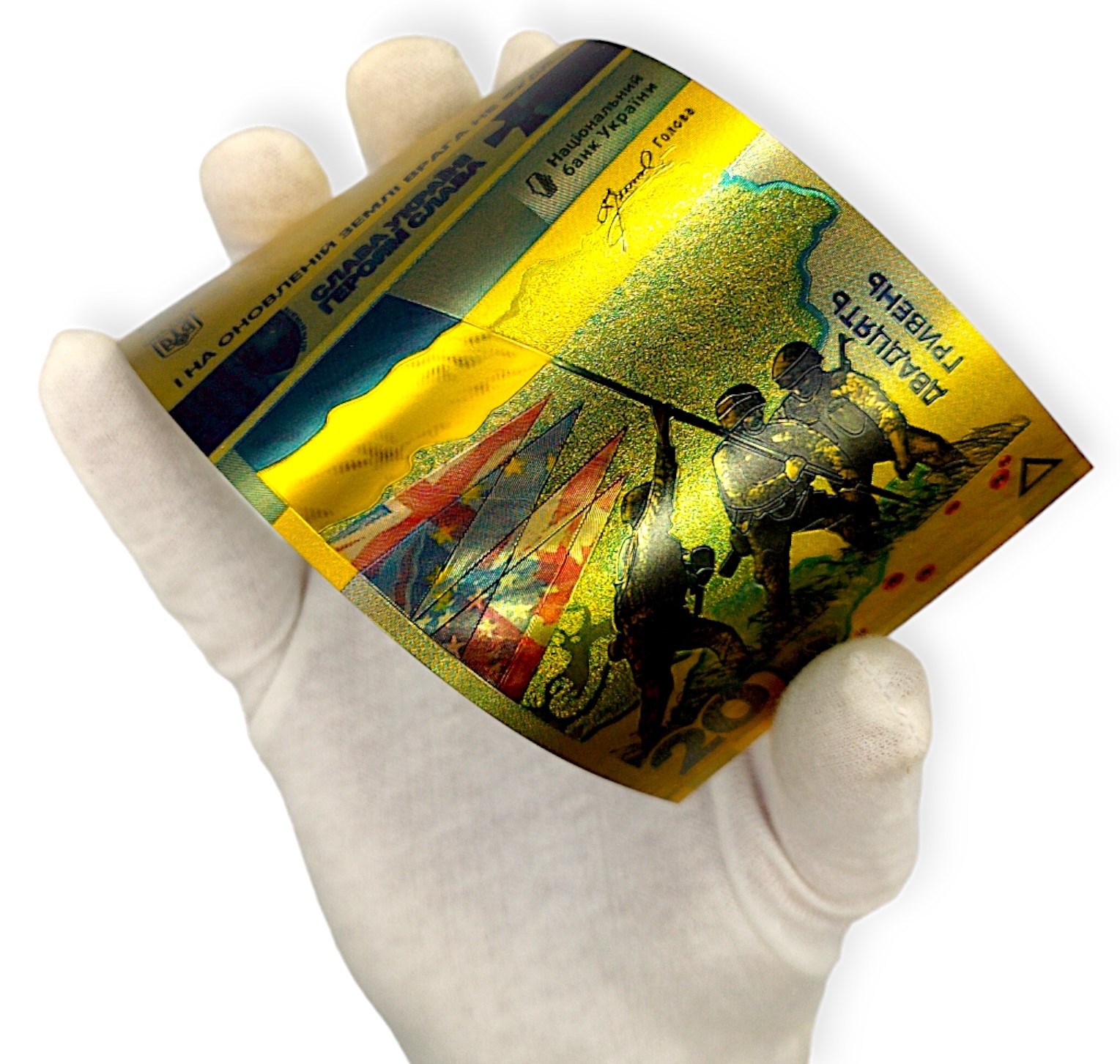 Точная копия украинской циркулярной банкноты, изготовлена из ПВХ и покрыта фольгой золотого цвета.
