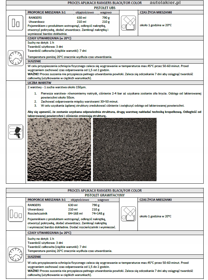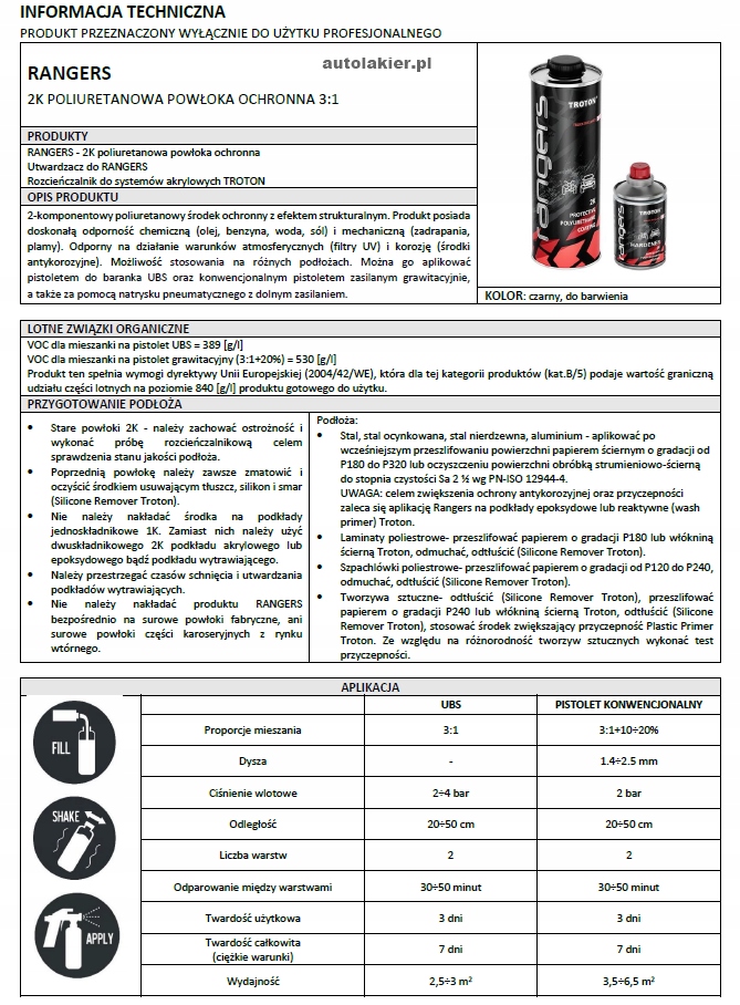 - Сталь, оцинкованная сталь, нержавеющая сталь, алюминий – наносить после шлифовки поверхности наждачной бумагой с зернистостью от P180 до P320 или очистки поверхности абразивоструйной обработкой до степени чистоты Sa. 2 ½ согласно PN-ISO 12944-4. Для повышения антикоррозионной защиты и адгезии рекомендуется нанести Рейнджерс на эпоксидные или реактивные грунты (Wash Primer) фирмы Тротон.
