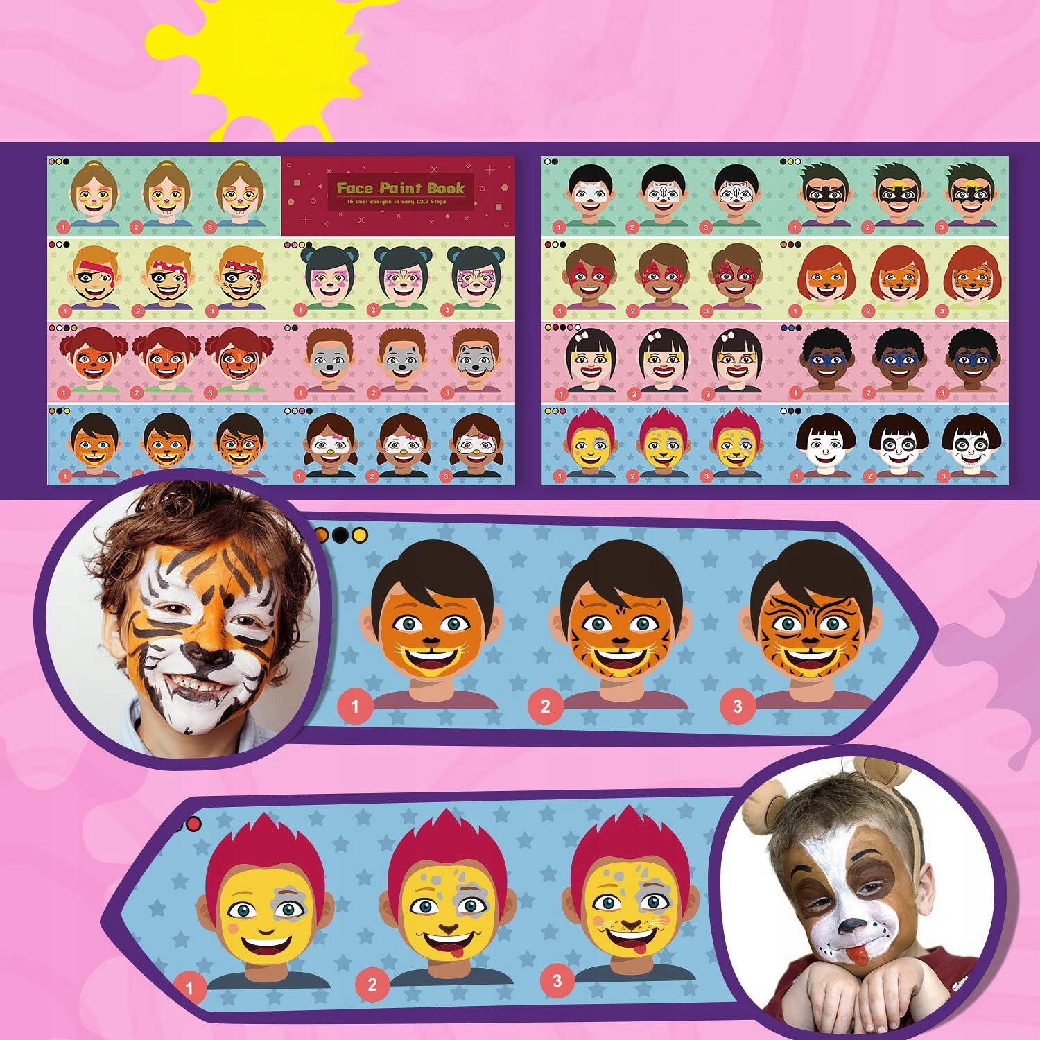 Этот набор для детского макияжа пигментирован на водной основе, и перед использованием его необходимо смешать с водой. Добавьте несколько капель воды, чтобы получить желаемый цвет, превратите поверхность в пасту, нанесите на поверхность кожи кистью, она очень легко красится и быстро сохнет. Легко чистить, достаточно протереть влажной или мыльной тряпкой.