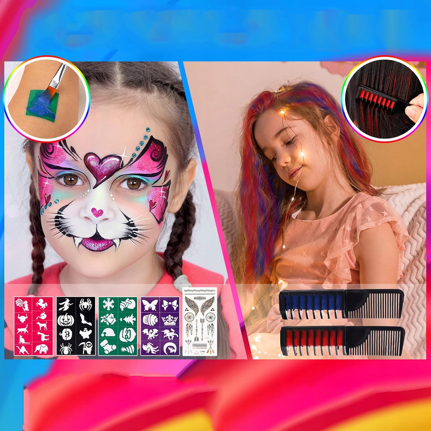 Наш детский набор для макияжа включает в себя 20 акварельных красок, 3 кисти, 34 различных трафарета для рисования лица, 5 наклеек . В этот набор для макияжа также входят блоки краски для волос, блестки, подводка для глаз и другие аксессуары. Это самый универсальный и богатый набор, который заставит вас сиять и выделяться на вечеринке!