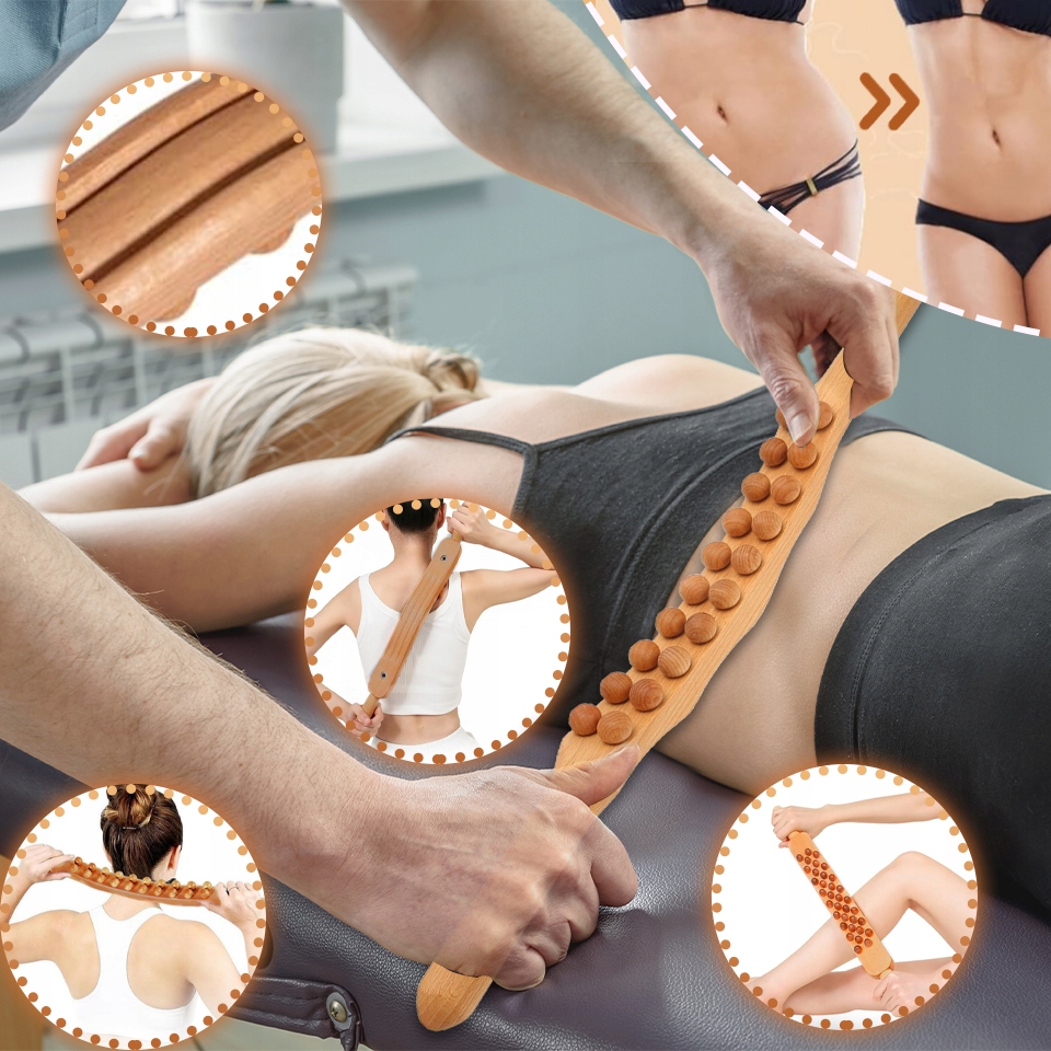 Деревянная массажная палочка изготовлена из высококачественной натуральной древесины, обугленной при высокой температуре. Имеет 20 массажных шаров. Вручную для гладких, трещин и поверхностей поверхности, тонко зафиксированной и полированной, изогнутая структура подходит для тела, не царапая кожу. Они гладкие и долговечные