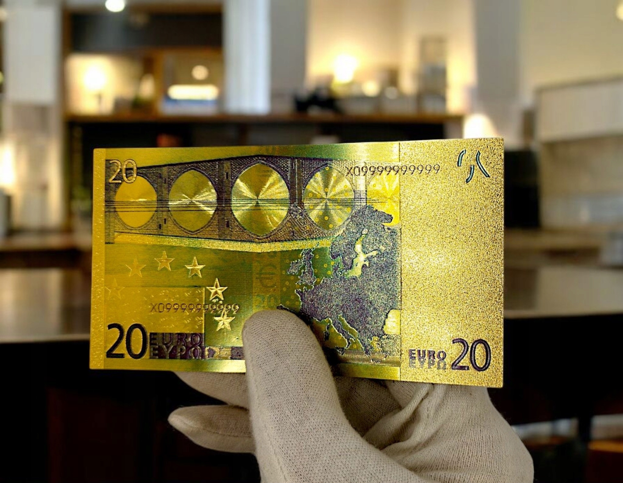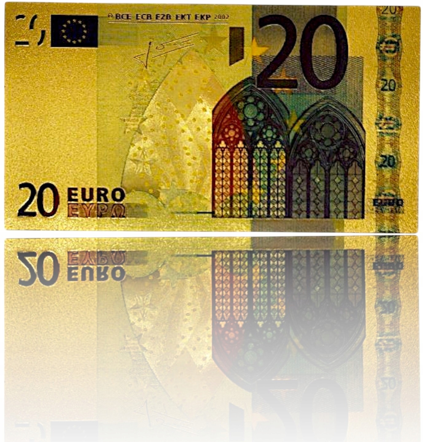 чрезвычайно эффективные банкноты коллекционера 20 евро, изготовленные из высококачественного ПВХ и покрытый блестящим золотым пленкой. Это не только подражание оригинальной банкноте, но и реальное произведение нумизматического искусства, которое привлекает внимание его роскошным внешним видом и вниманием к каждой детали. H2> Архитектурные мотивы и карта Европы на обороте дают банкноту престижный персонаж, а золотой блеск делает его идеальным в коллекции, кабинете или в качестве необычного подарка.