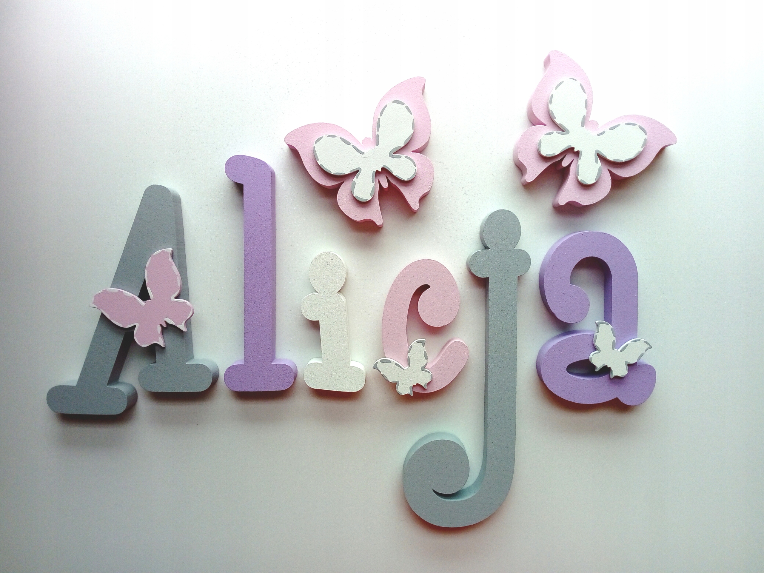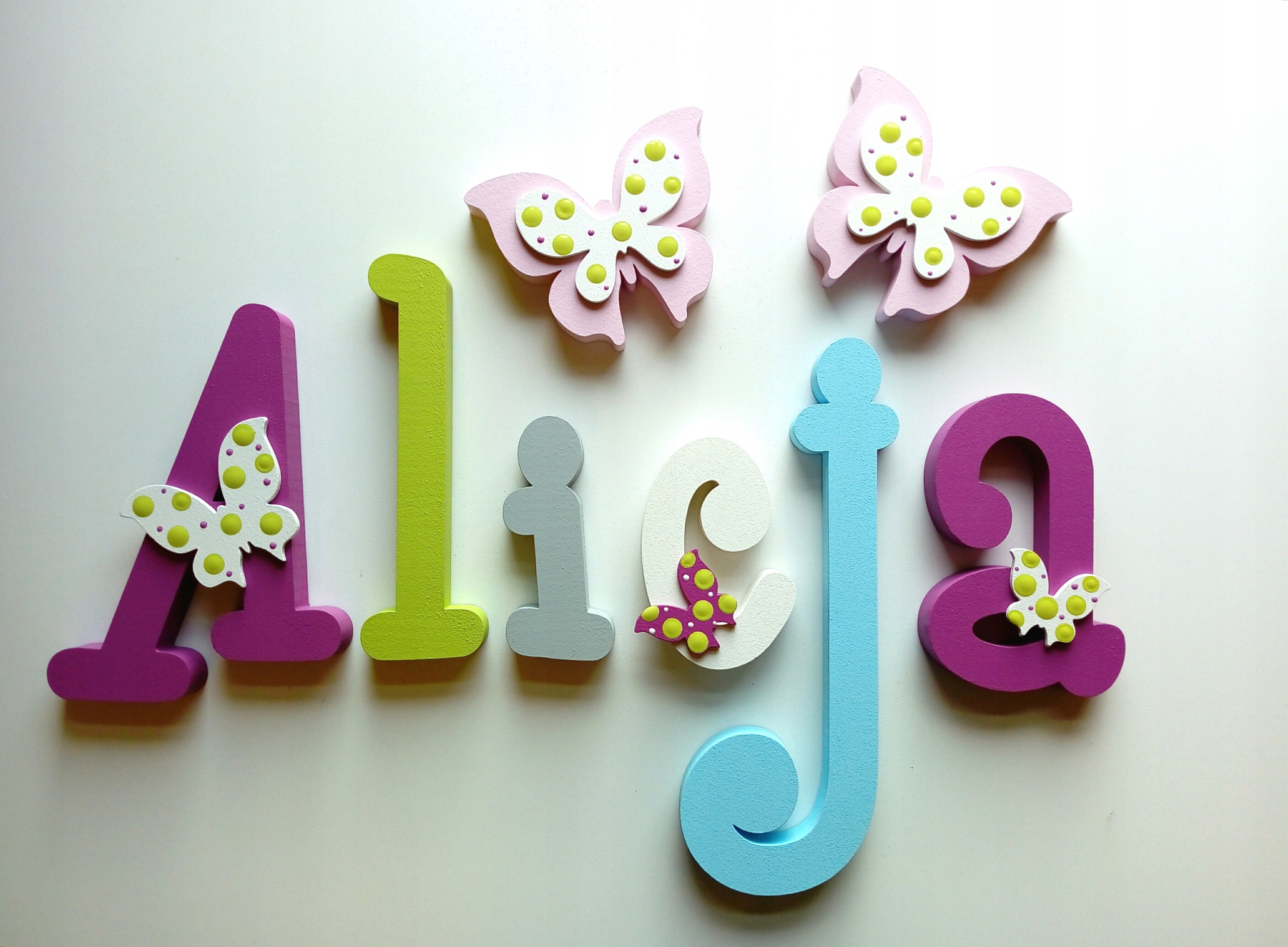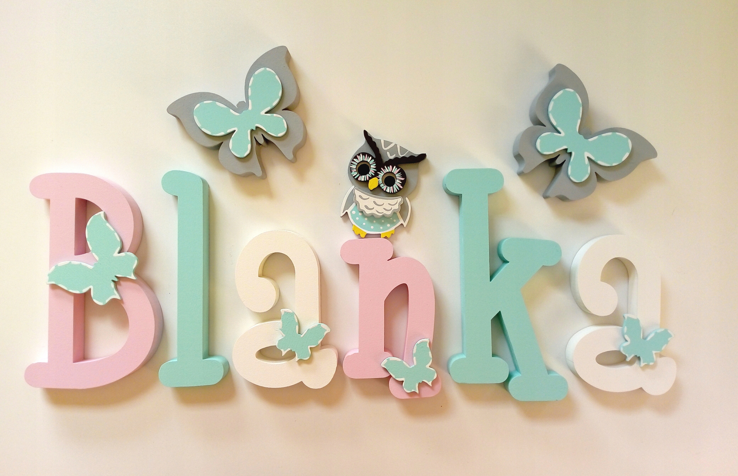 В продаже имеются красивые, расписанные вручную и украшенные ажурными фанерными украшениями-буквы, из которых можно составить имя вашего ребенка.