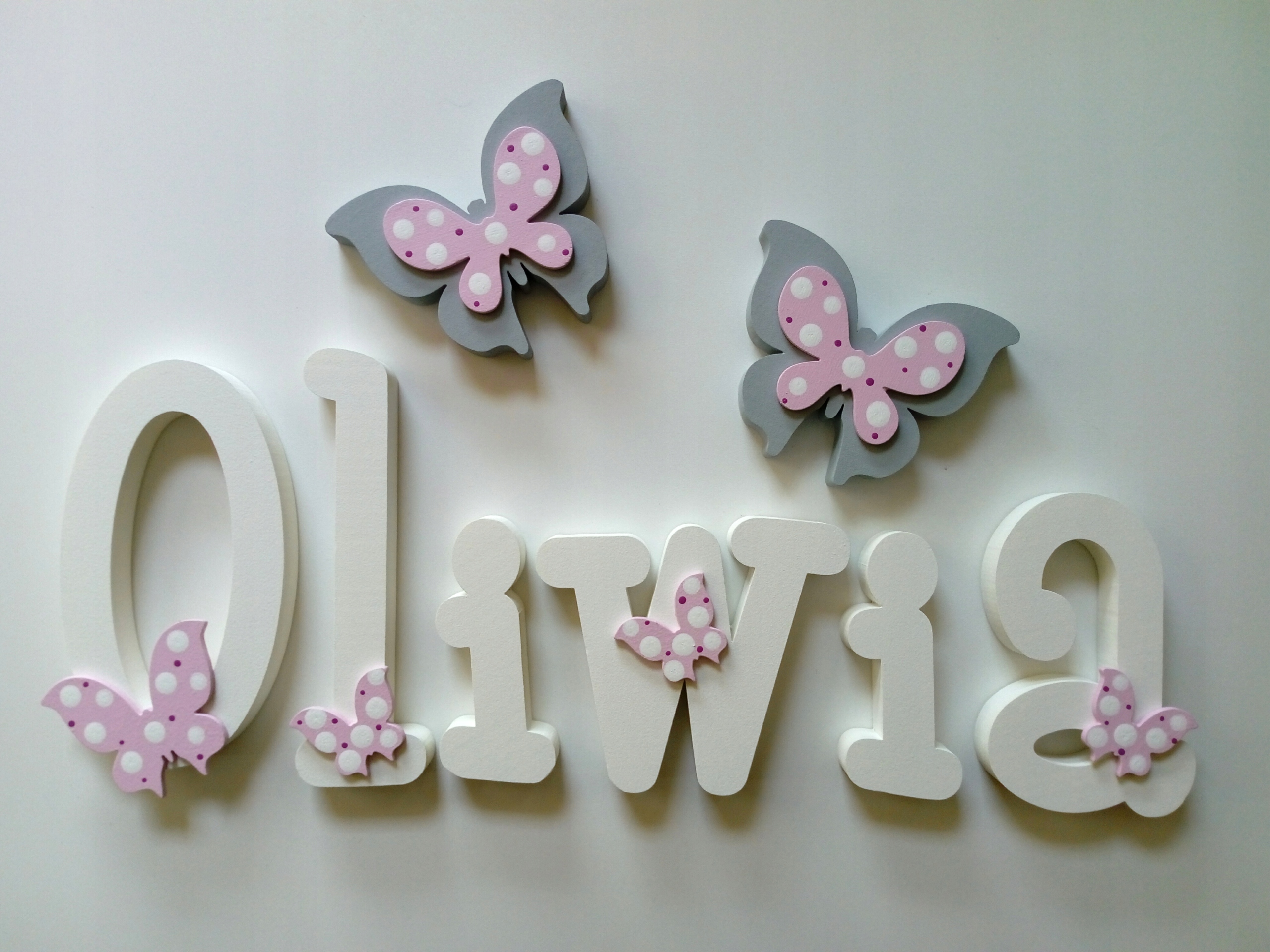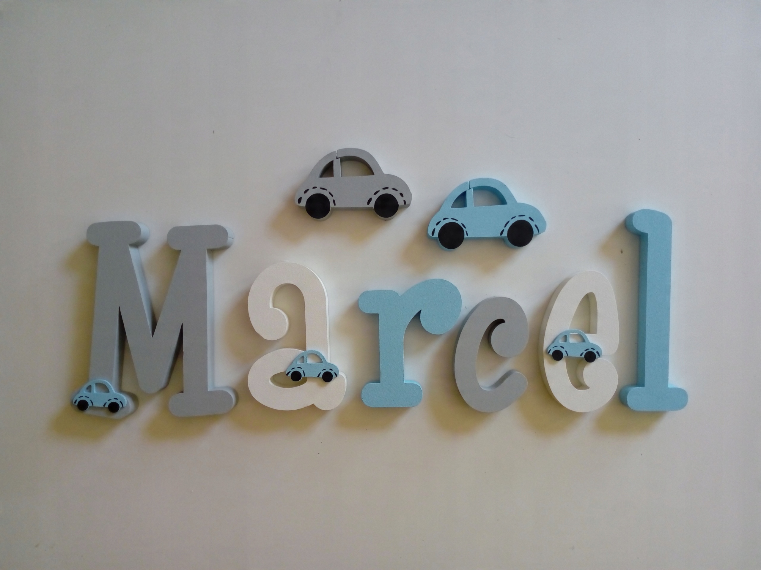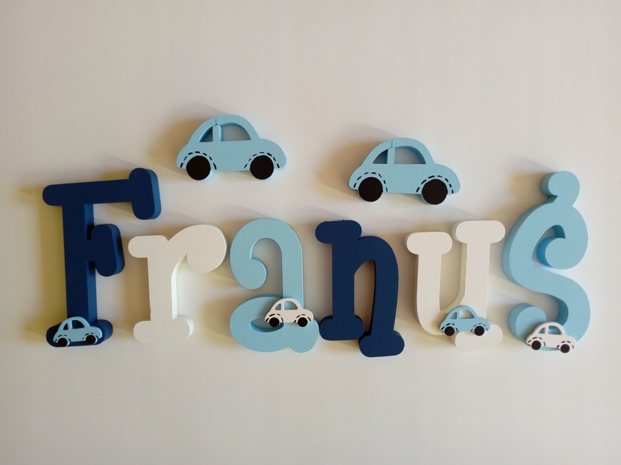 В продаже имеются красивые, расписанные вручную и украшенные ажурными фанерными украшениями-буквы, из которых можно составить имя вашего ребенка.
