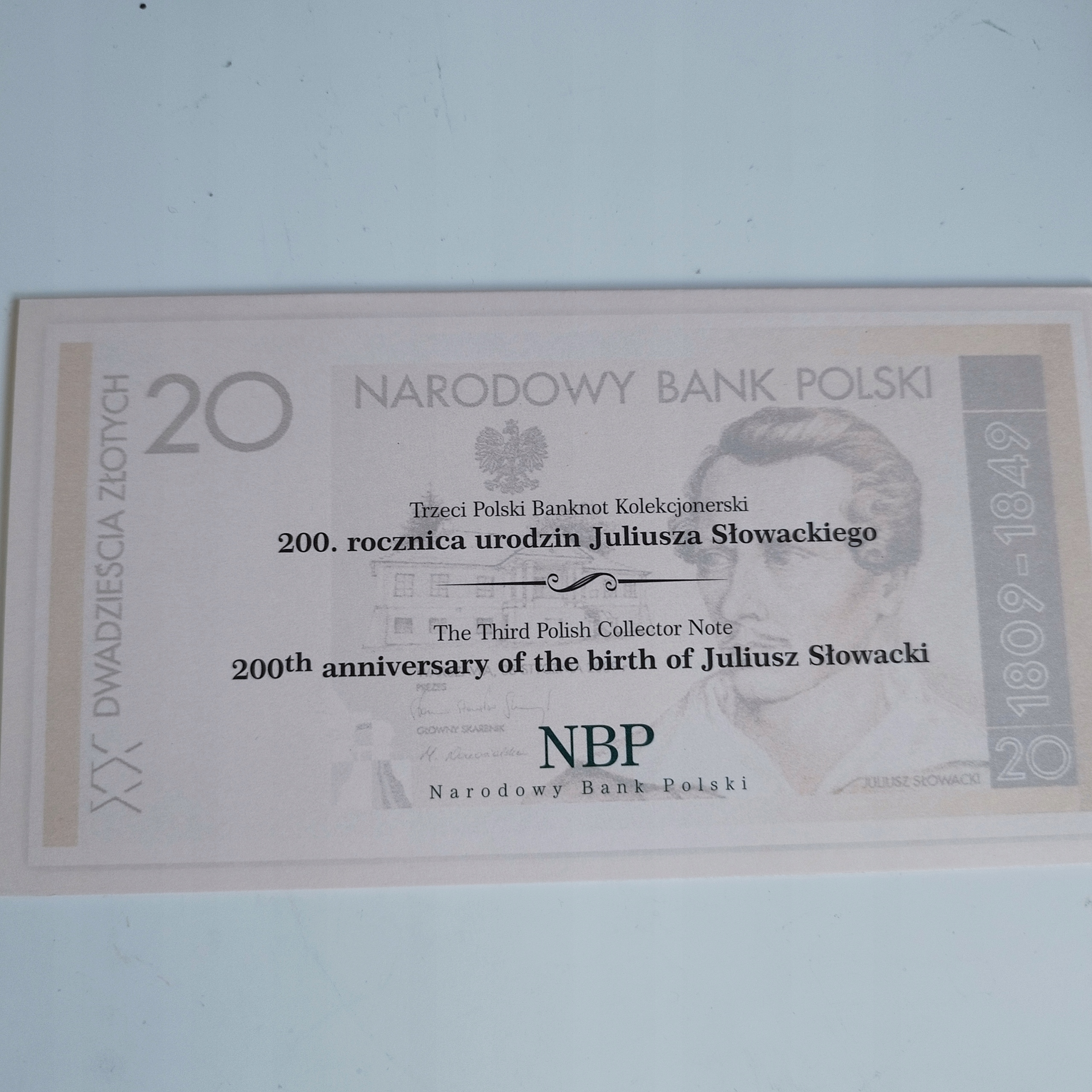 Банкнота номиналом 20 злотых, посвященная 200-летию со дня рождения Юлиуша Словацкого.
