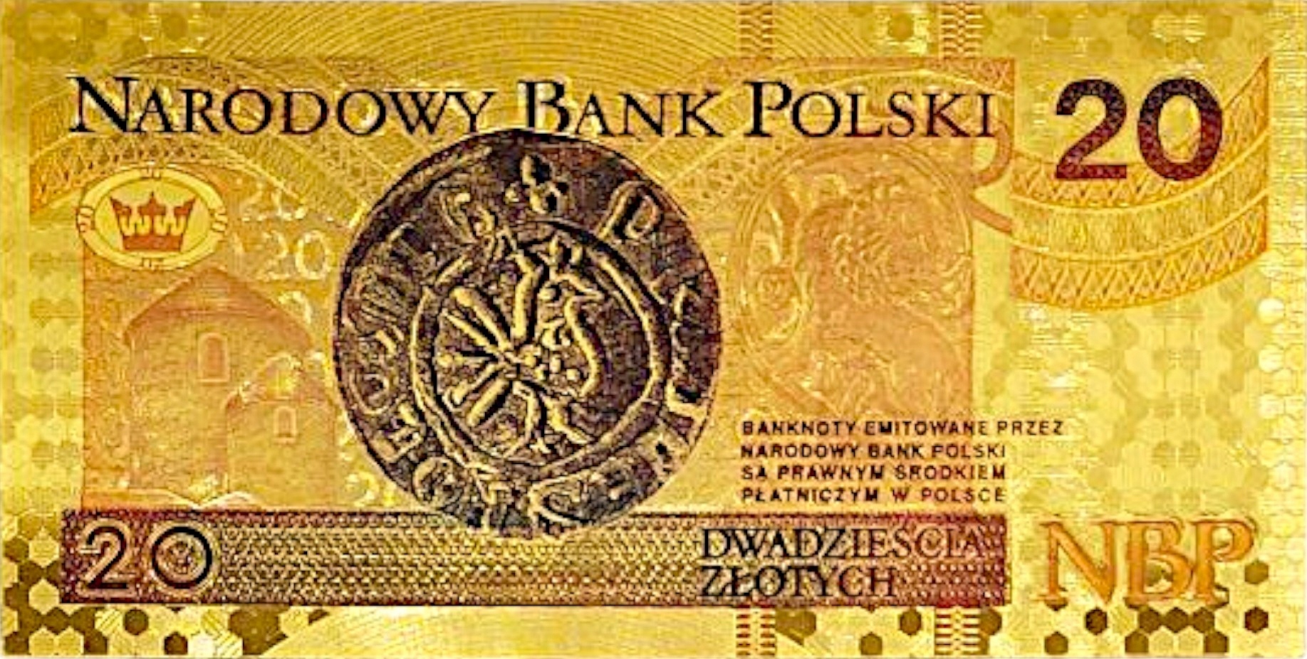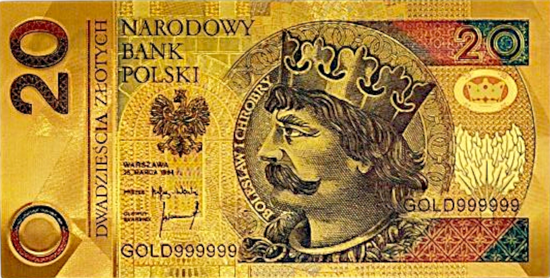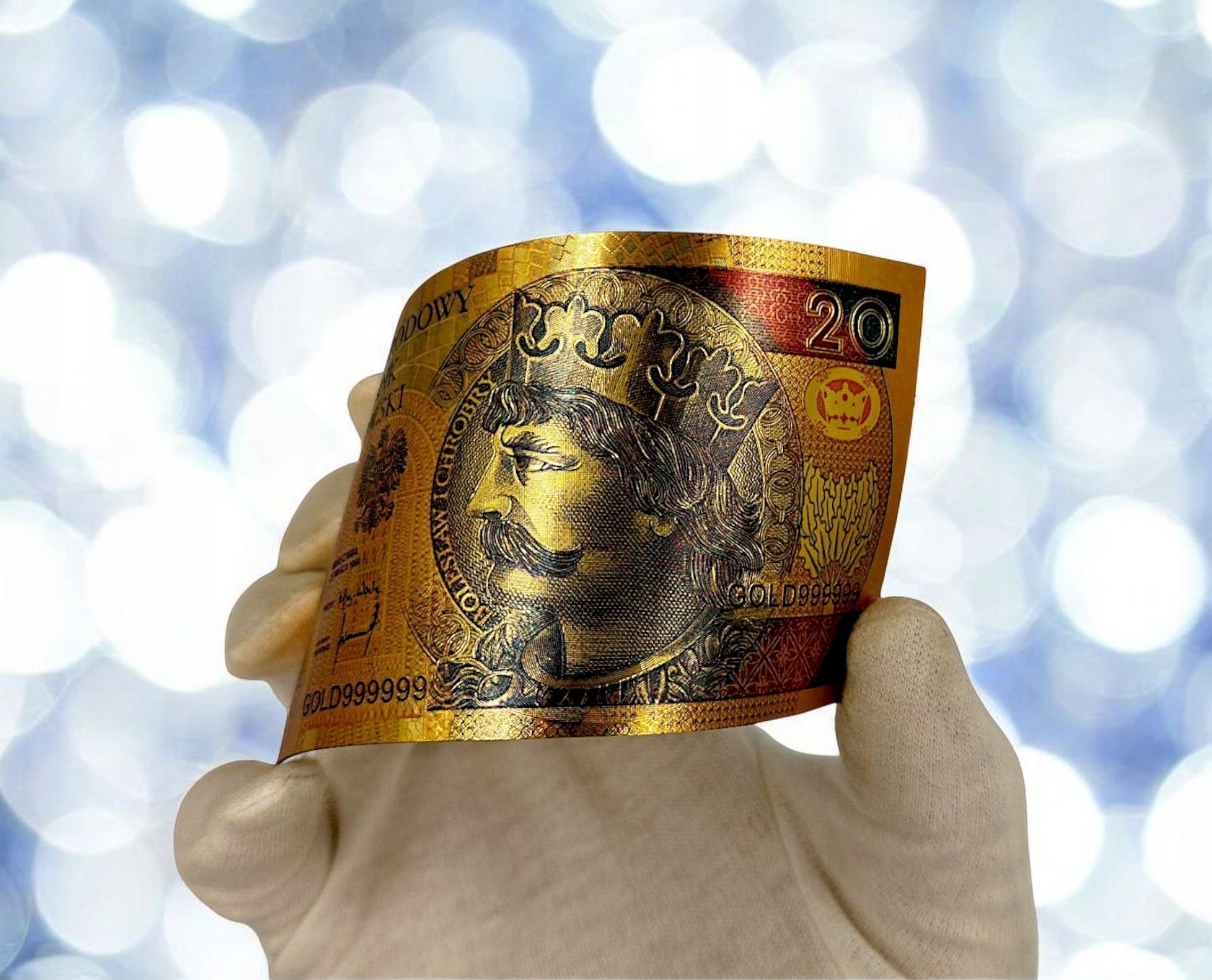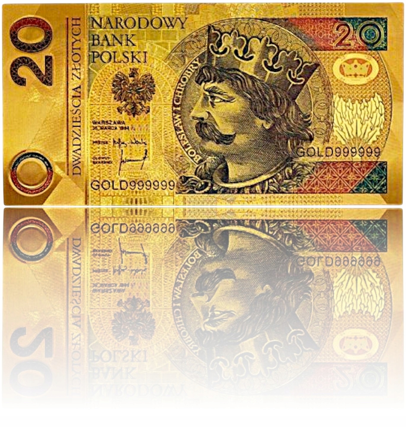 Красивая коллекционная позолоченная банкнота из ПВХ номиналом 20 злотых BOLESŁAW CHROBRY
