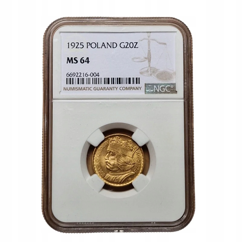 Польша Вторая Польская Республика 20 злотых 1925 г. Р. Болеслав Храбрый, NGC MS 64 высокой пробы, монета из золота NGC низкой пробы - Au.900, вес 6,45 г, диаметр; 21 мм, край; зубчатые