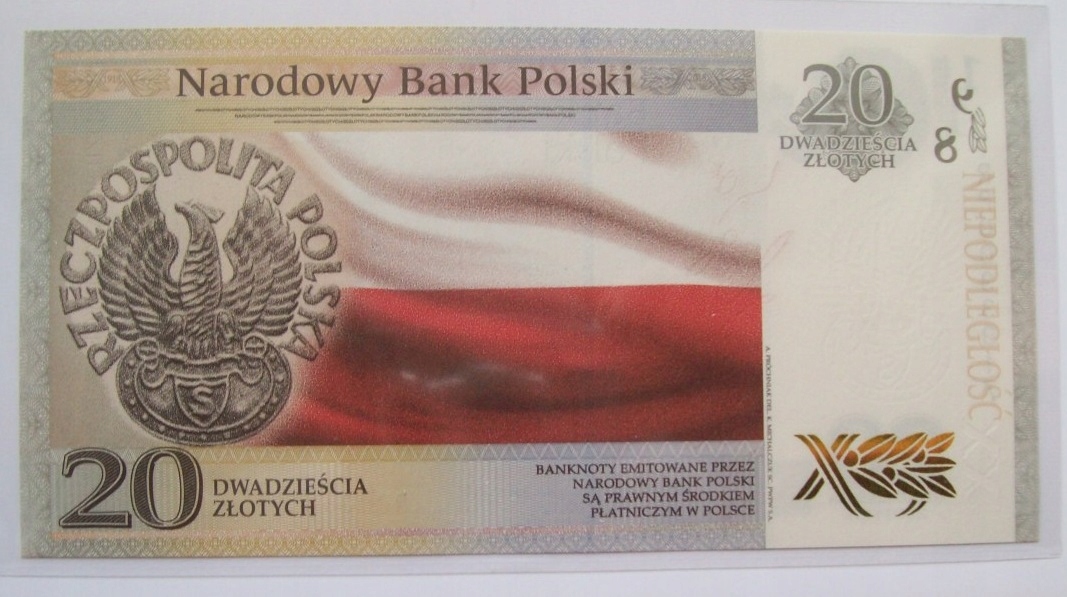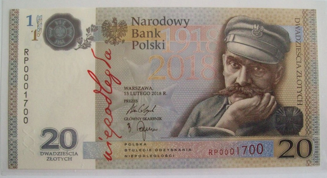 20 злотых с 2018 г. НЕЗАВИСИМОСТЬ UNC государства. номер 0001700