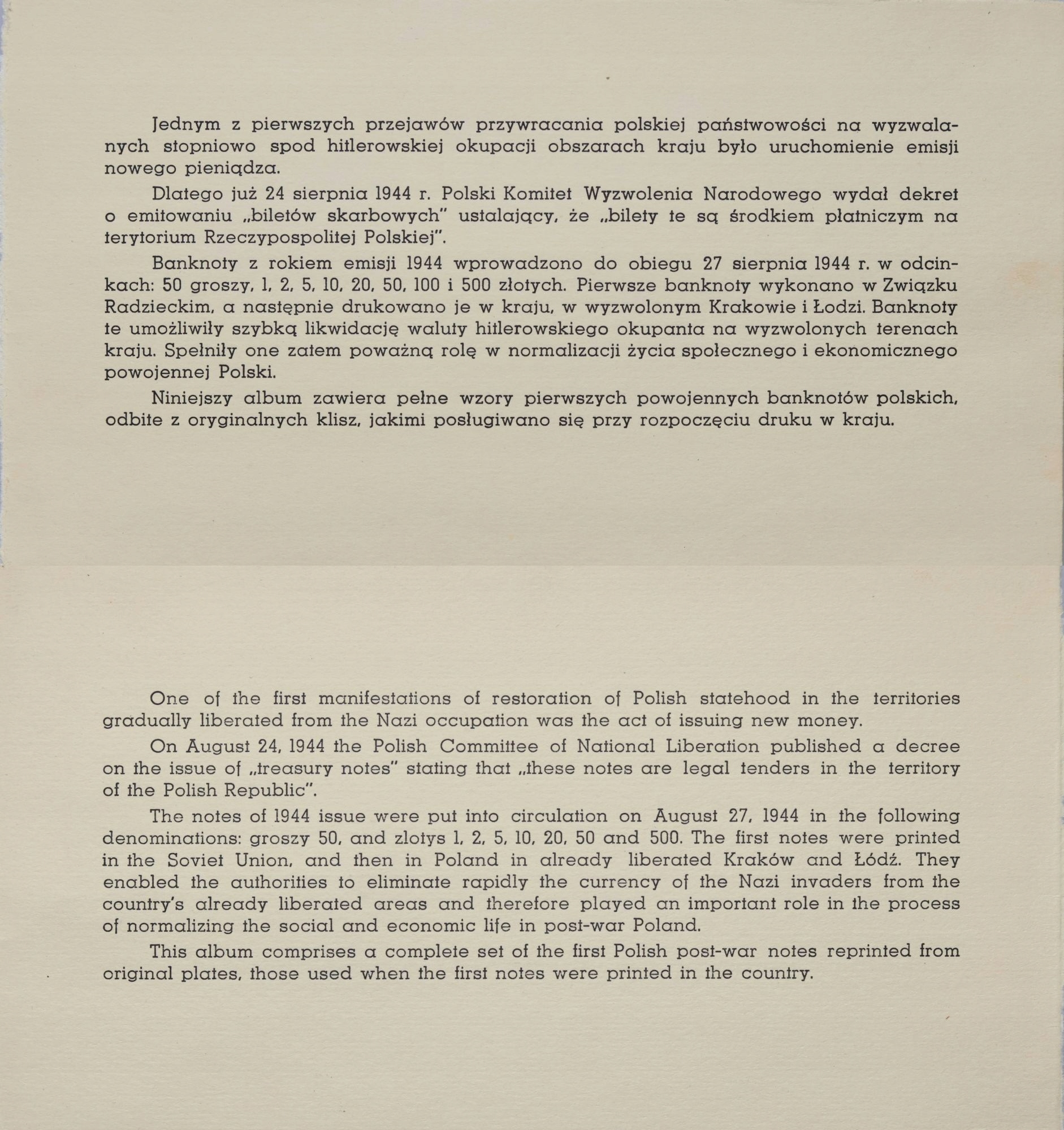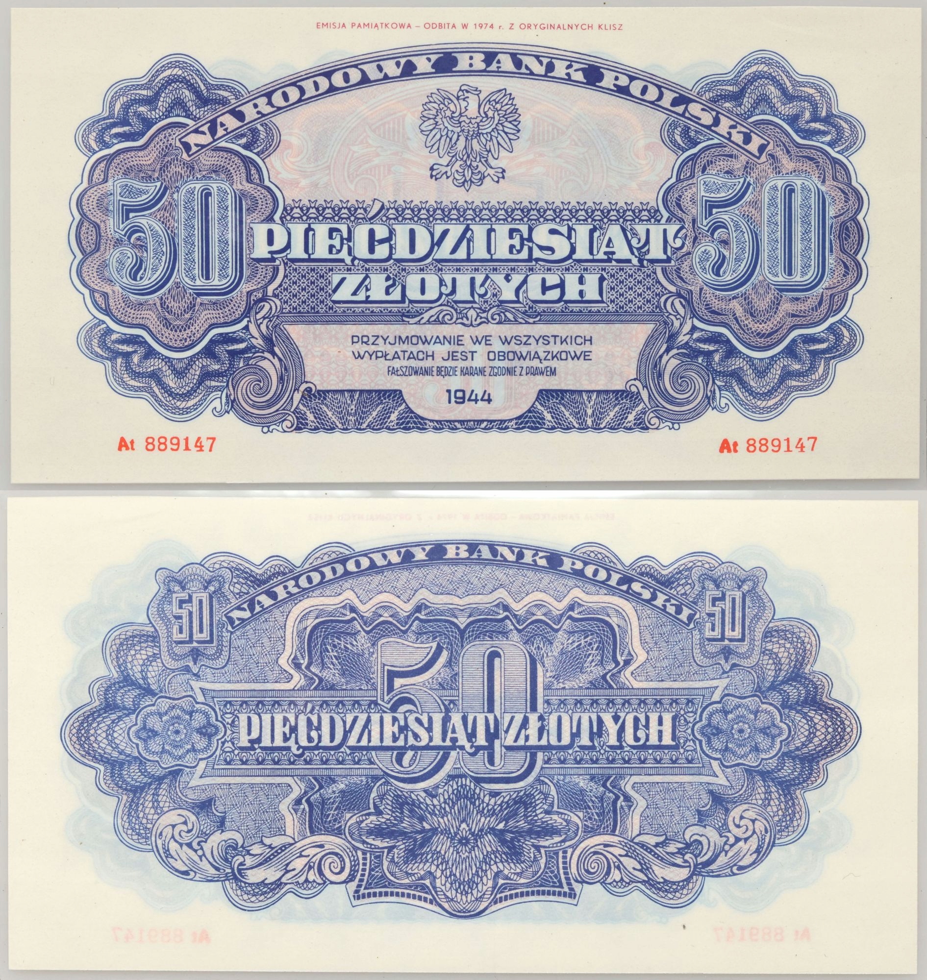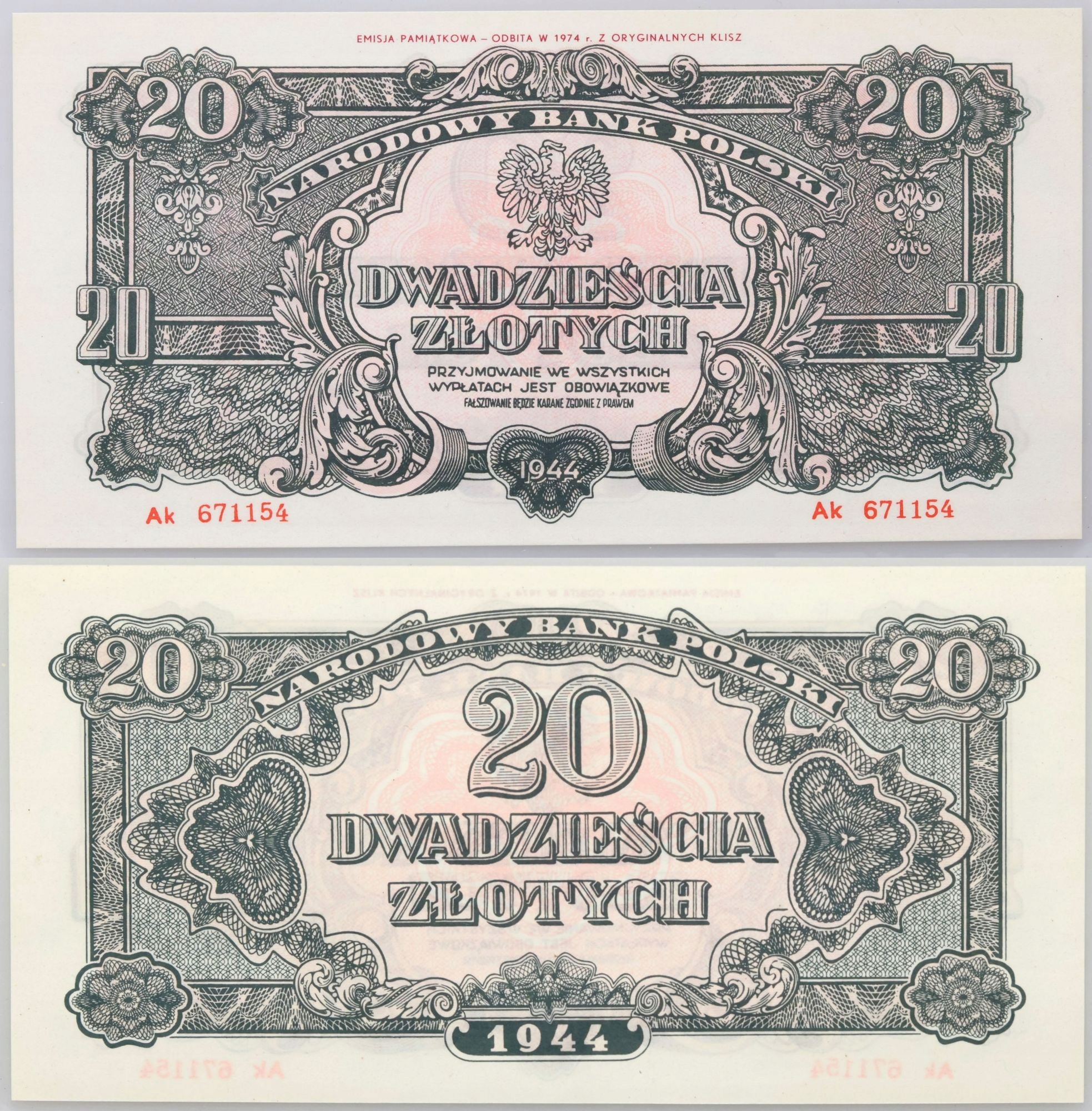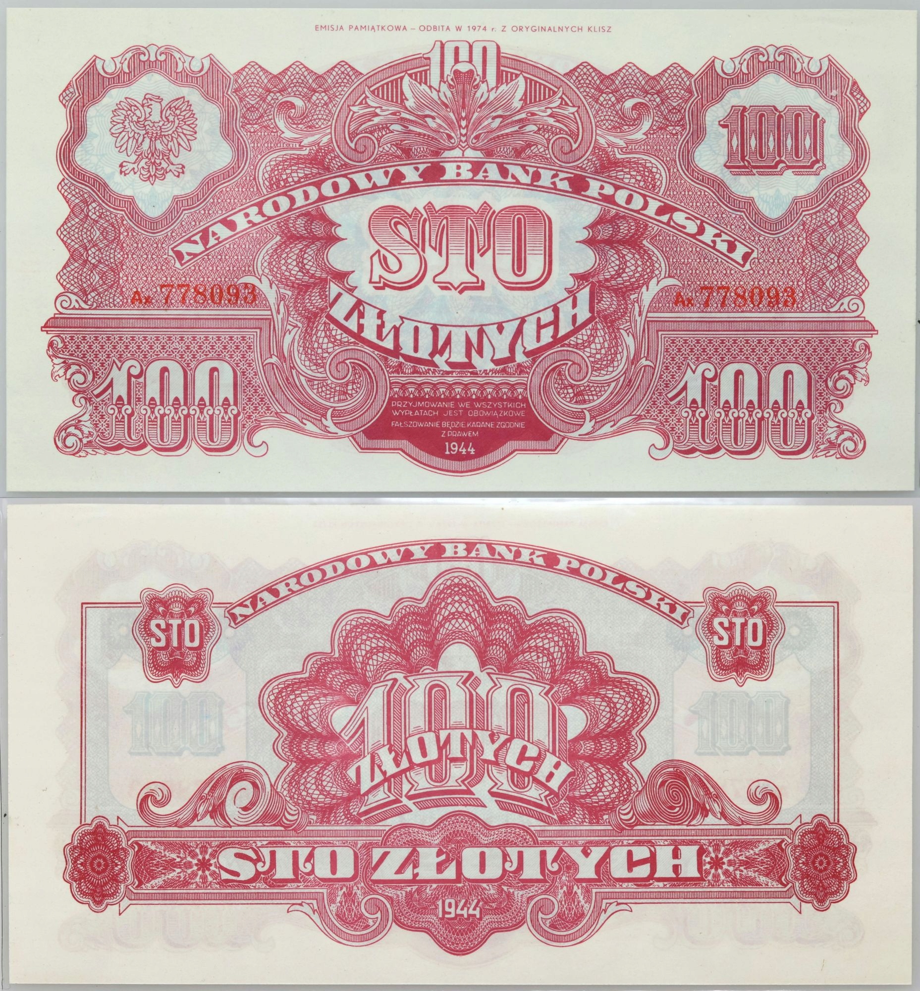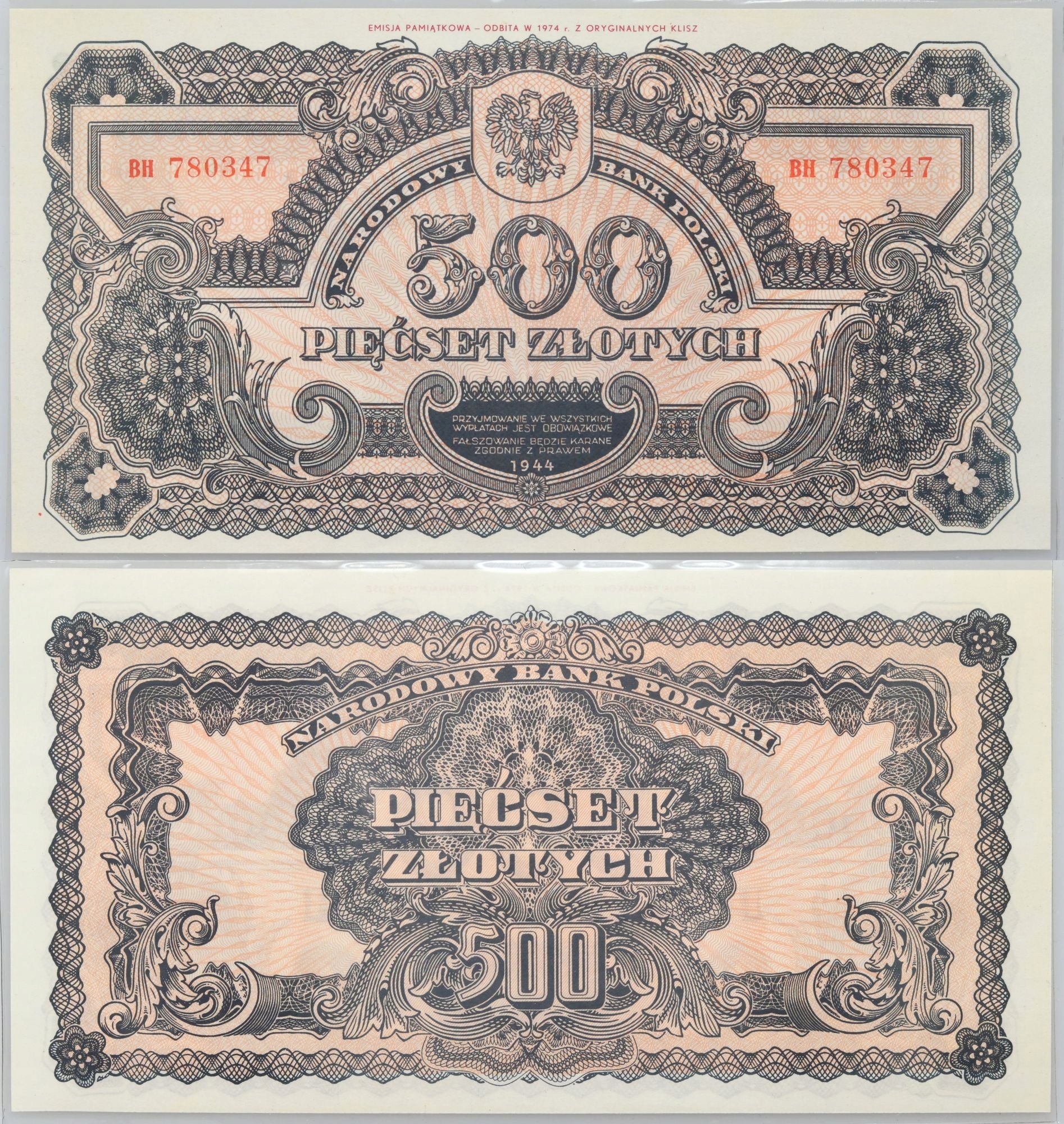 20. ПРЛ, Серия репринтов 1-500 злотых 1974 г., выпуск 1944 г.
