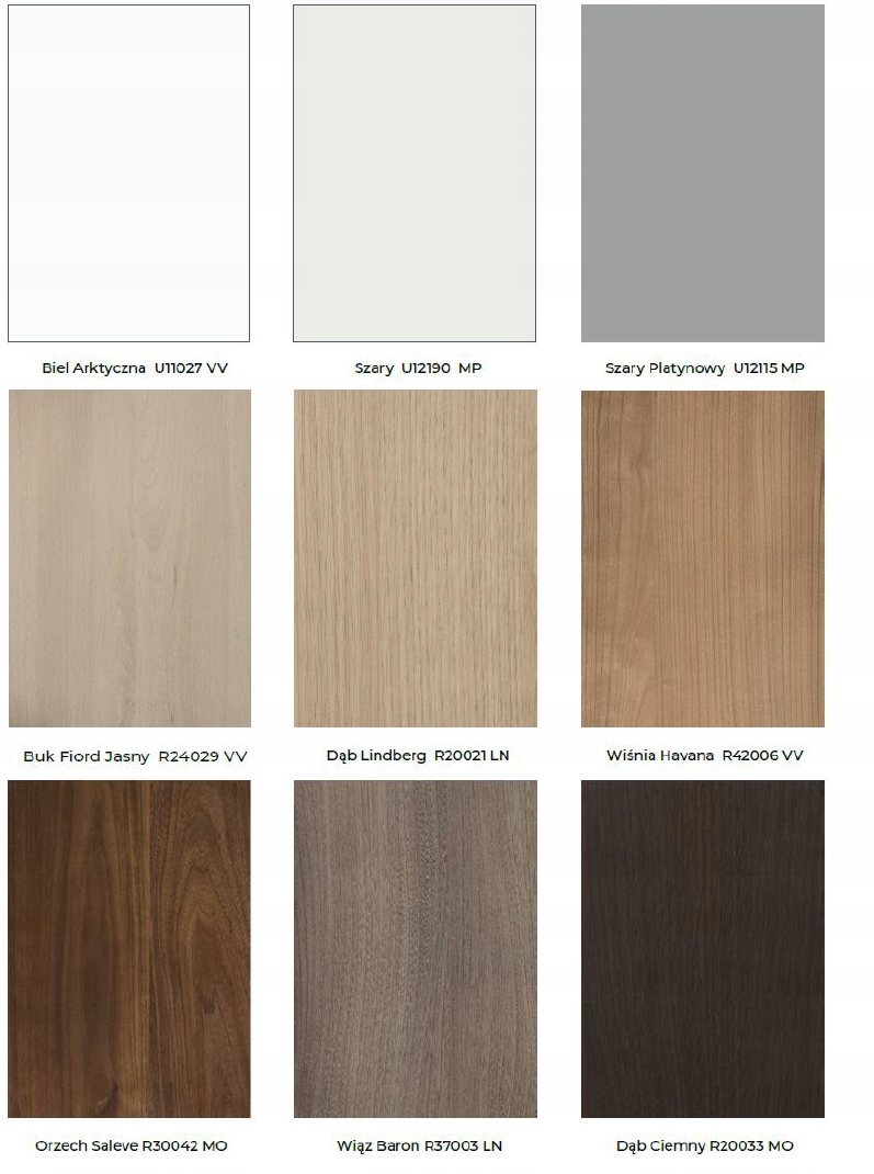 Арктический белый, серая платина, гавана вишня, ореховый орех, экологический орех, эльм, буки, темный дуб, дуб Линдберг и другие