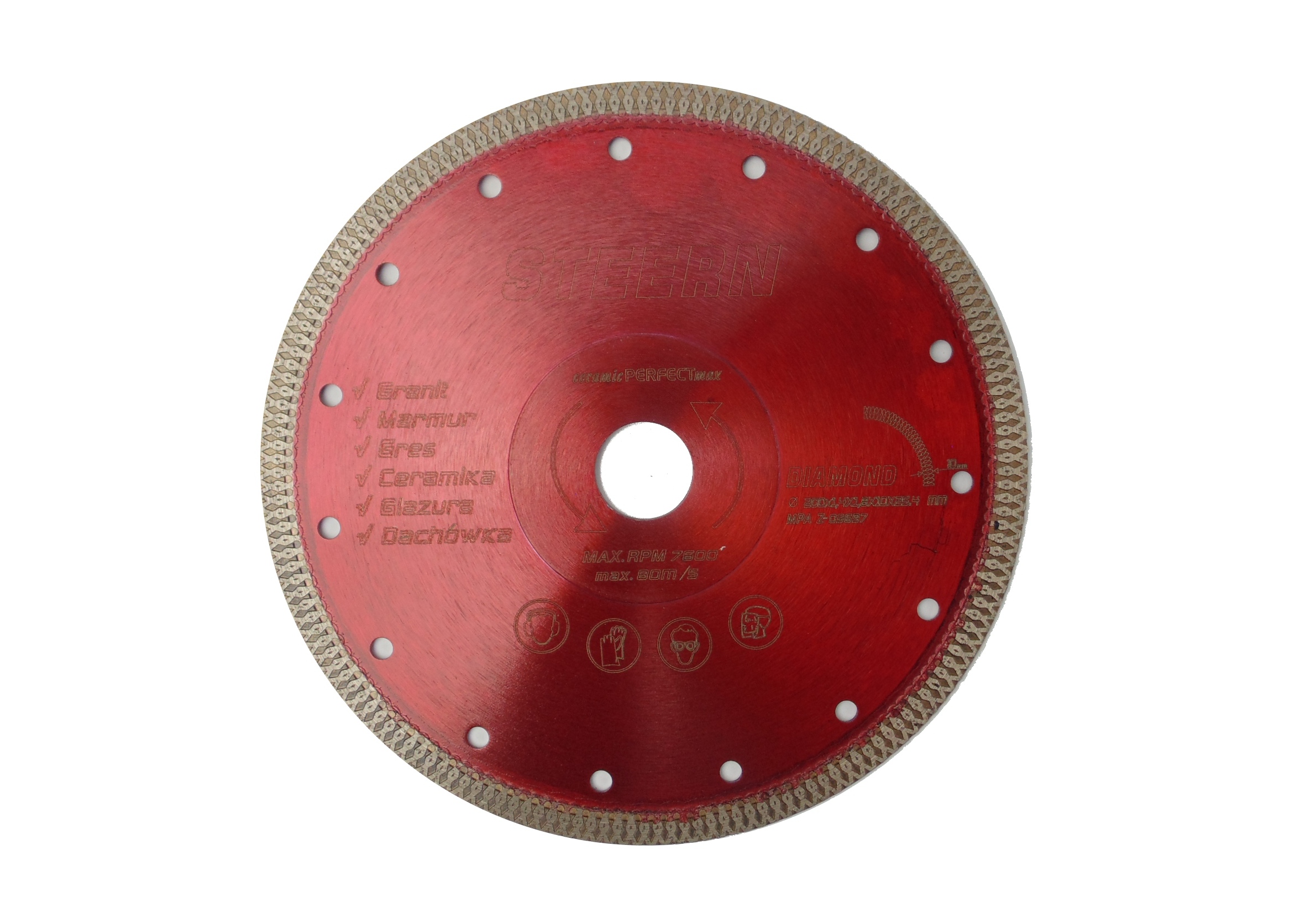 Профессиональный алмазный диск для резки гранит, мрамор, керамогранит, керамика, черепица и черепица с высокими техническими параметрами. Узкий сегмент с переменным поперечным сечением обеспечивает очень высокую скорость резания даже самых твердых и толстых материалов, в том числе благодаря: уменьшение бокового трения. Дополнительным преимуществом диска CERAMIC PERFECT MAX является многослойный, клееный, звукоизолированный и усиленный диск. Профессиональный инструмент для всех видов каменных и плиточных работ.