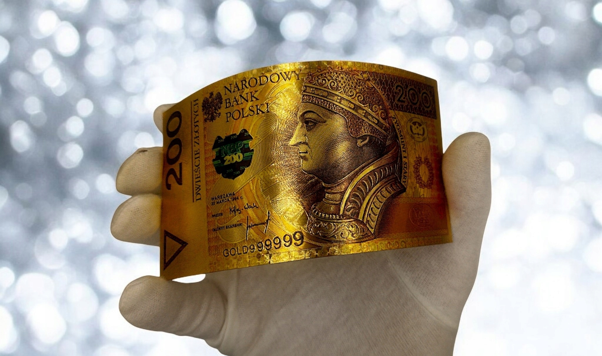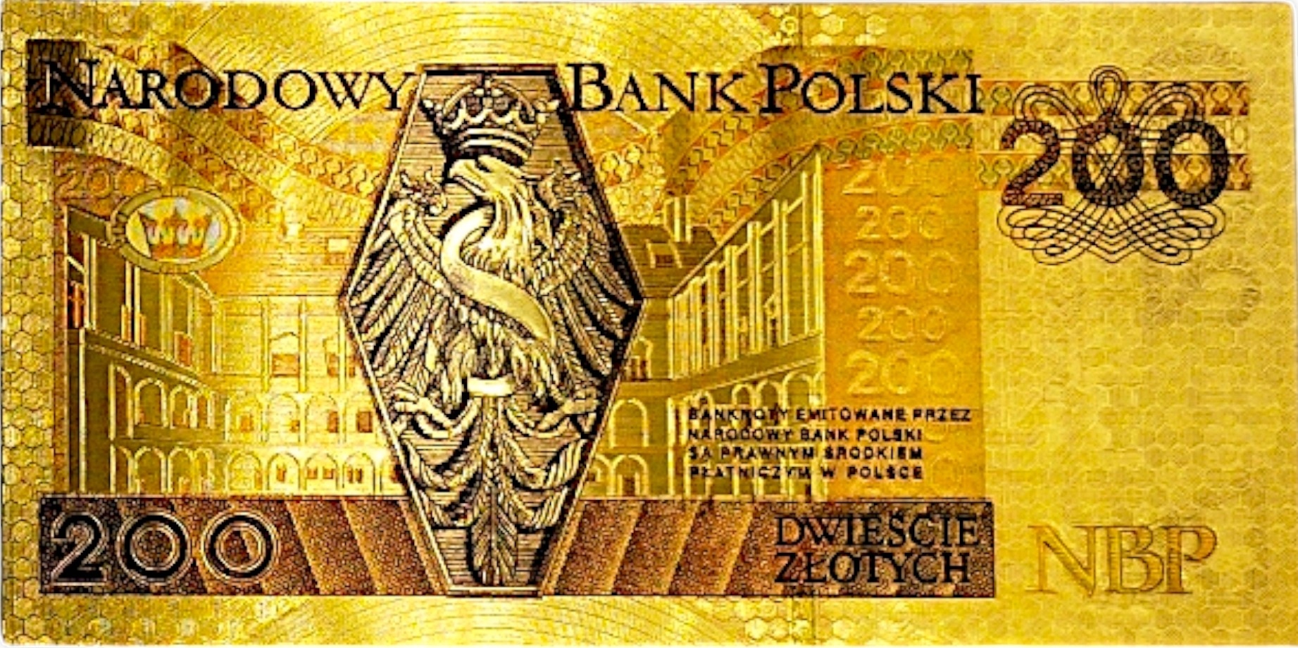 Позолоченная банкнота из ПВХ номиналом 200 злотых станет отличным приобретением для каждого коллекционера. Изготовленный с высочайшей точностью, он излучает престиж и элегантность. Благодаря сложной позолоте банкнота имеет уникальный внешний вид и привлекает внимание своим роскошным блеском.