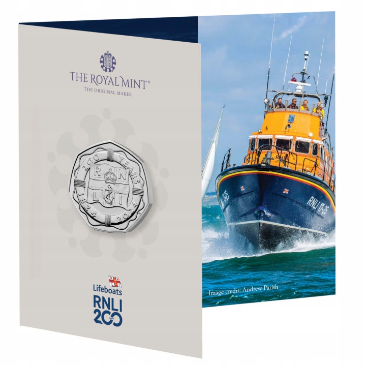 200 лет RNLI 50p Miedzionikel 2024 — монета, посвященная двухсотлетию RNLI — Королевского национального института спасательных шлюпок, организации, занимающейся спасением на воде.