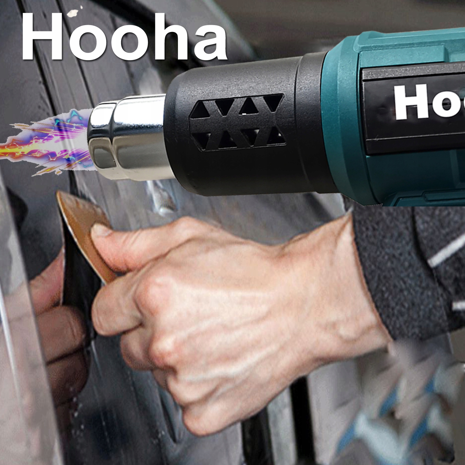 Универсальная тепловая пушка Hooha производит струю очень горячего воздуха, для ремонта базовой защиты лакокрасочного покрытия, для работы с термоусадочными материалами при монтаже, для сварки пластиковых элементов, для сушки влажной краски, для профессиональная оклейка кузова и стекол автомобилей и т.д.