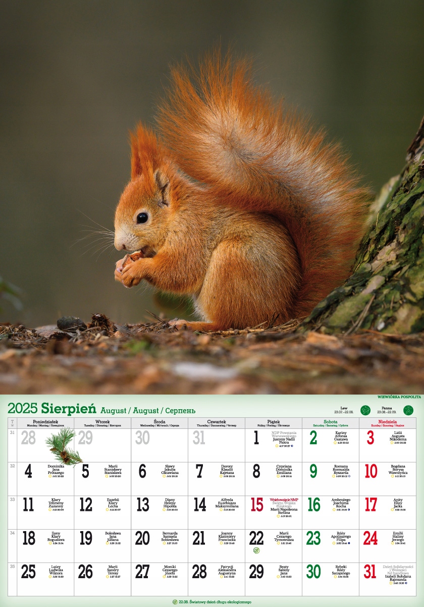 - Включает именины, названия праздников, время восхода и захода солнца, фазы Луны и знаки Зодиака.