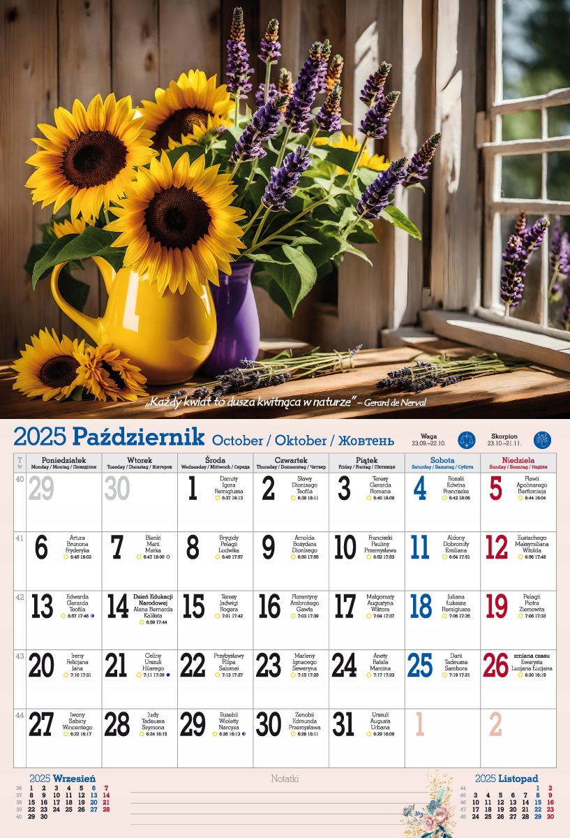 - Включает именины, названия праздников, время восхода и захода солнца, фазы луна, знаки Зодиака и романтические цитаты.