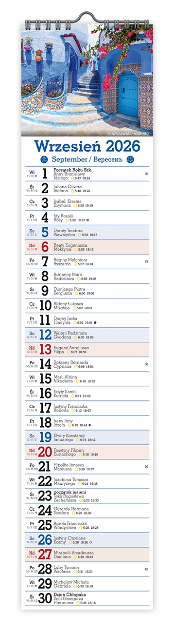 - В календаре указаны именины, названия праздников, время восхода и захода солнца, фазы луна.