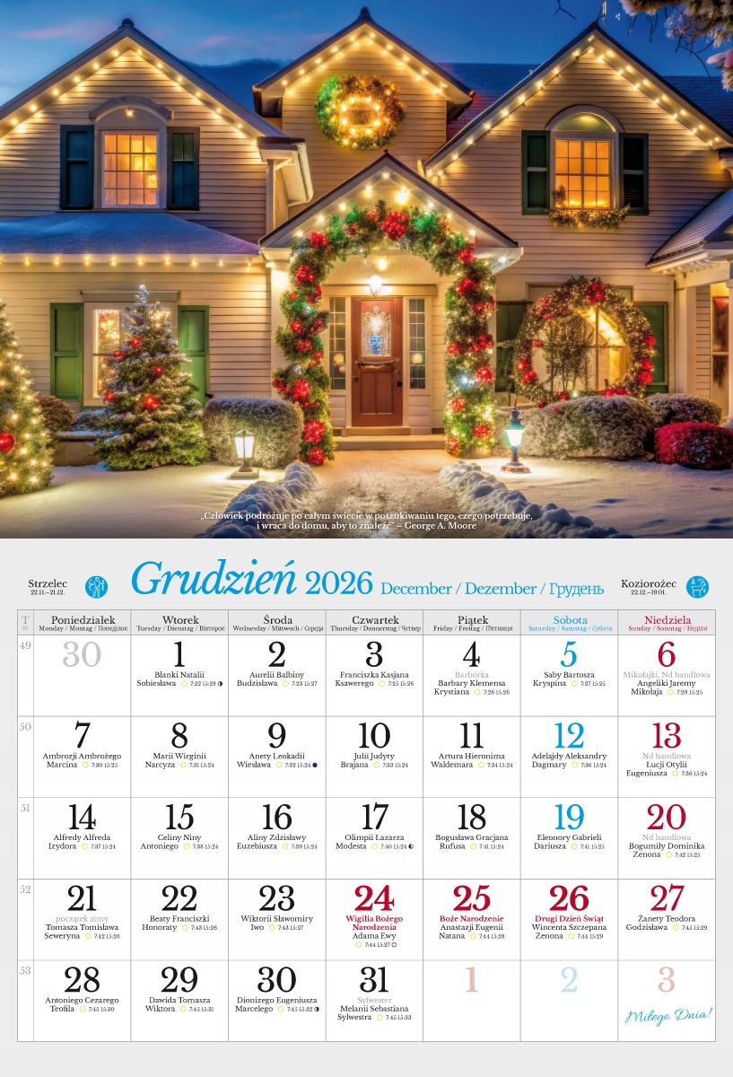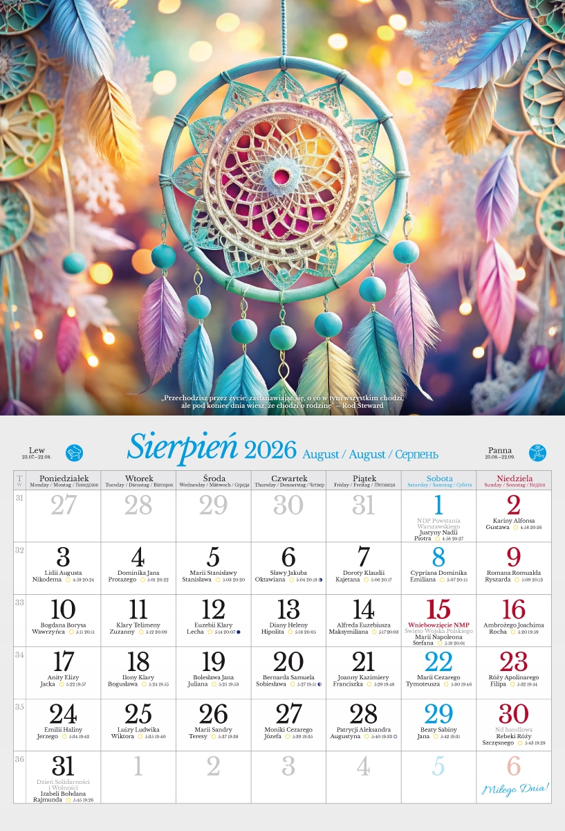 - В календаре указаны именины, названия праздников, время восхода и захода солнца, фазы Луны и Знаки Зодиака