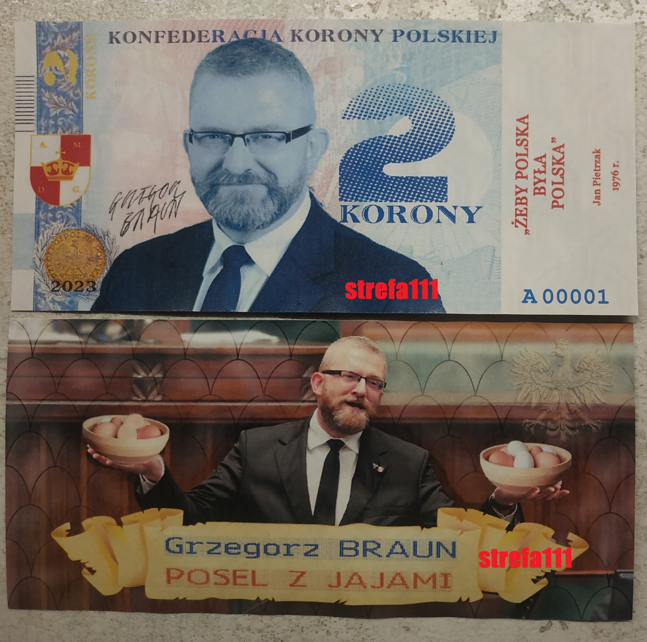 Банкнота номиналом 2 кроны с Гжегожем Брауном от 12 декабря 2023 года.
