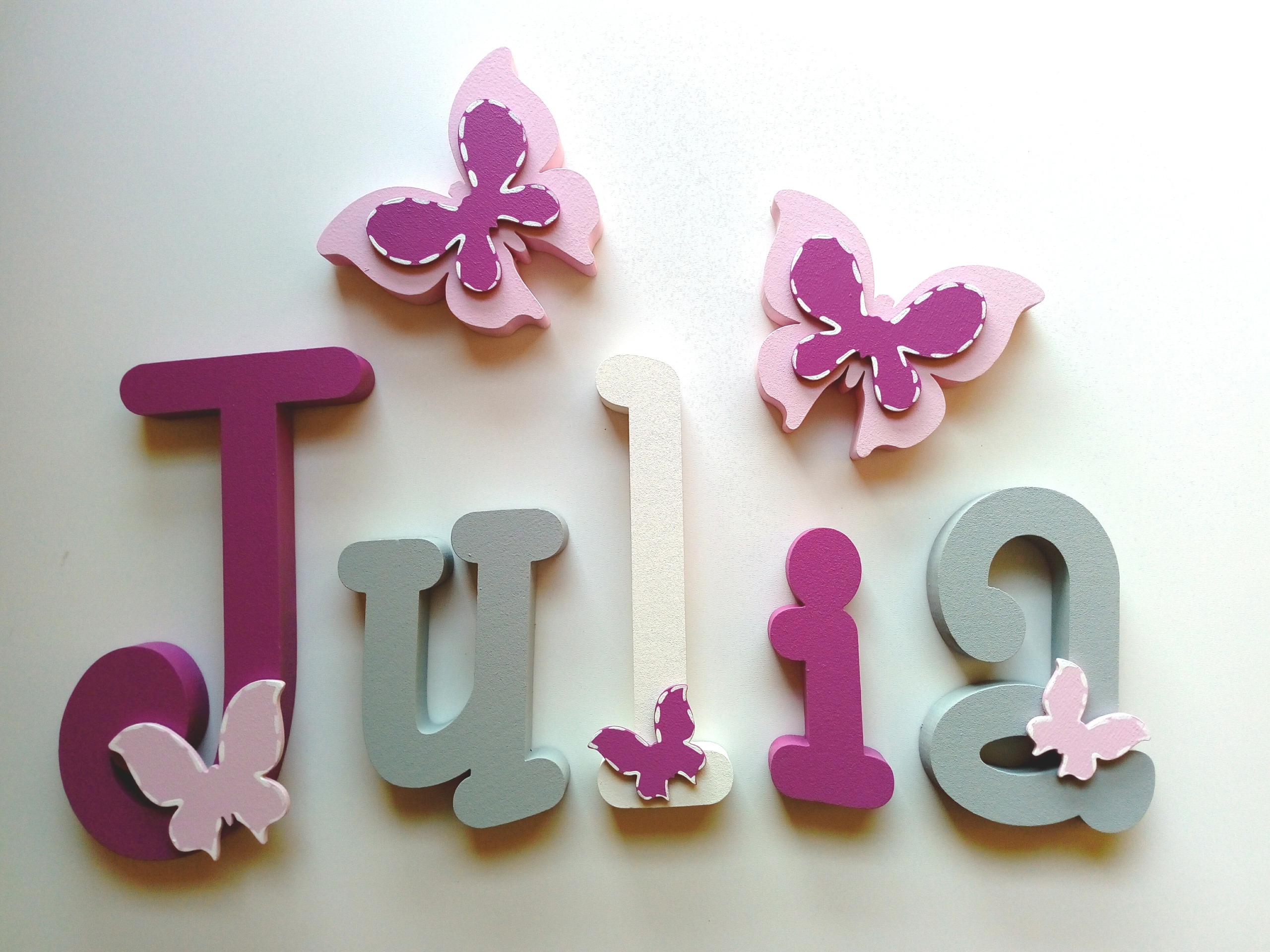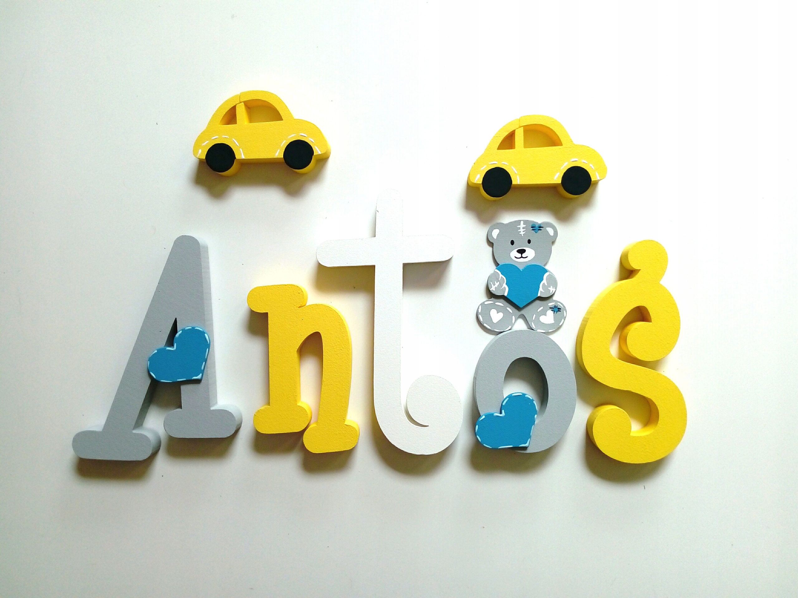 В продаже имеются красивые, расписанные вручную и украшенные ажурными фанерными украшениями-буквы, из которых можно составить имя вашего ребенка.