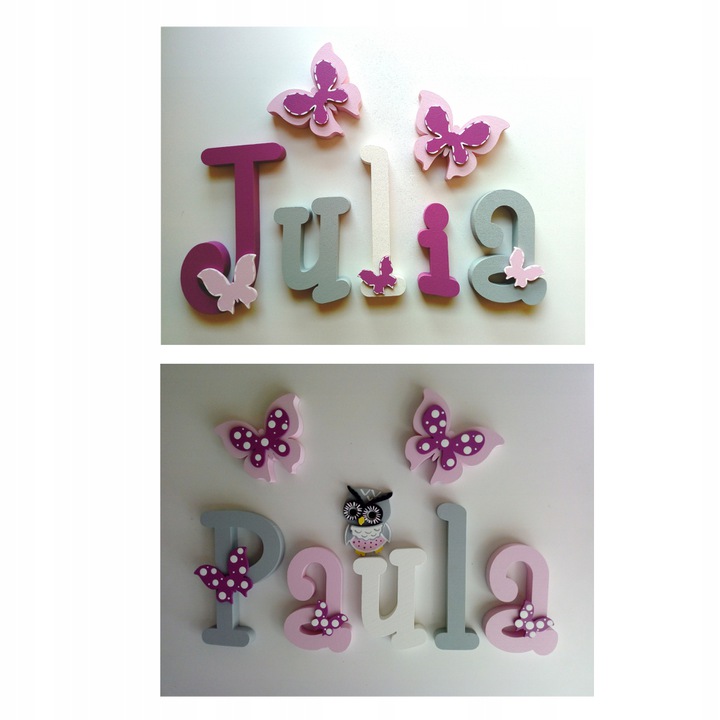 За каждое купленное имя вы получите два больших декора по 10 см над надписью и несколько маленьких декоров, приклеенных к буквам в местах разрезов, как в наших проектах в галерее ниже.