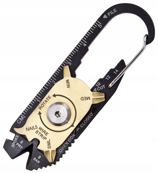 <ул>Функциональный, небольшой мультитул из высококачественной нержавеющей стали, покрытый слоем титана и стальным вращающимся модулем с четырьмя инструментами. Качественный шарикоподшипник обеспечивает его надежную работу. Диск фиксируется в одном из четырех положений. Застежка-карабин позволяет безопасно и комфортно носить инструмент.
