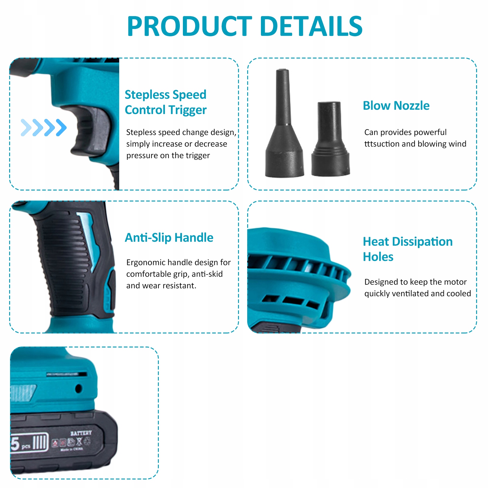 - Это своего рода высококачественный литиевый воздуходувка с мощным щеточным двигателем, обеспечивающим сильное всасывание и ветер. Быстрое рассеивание тепла, удобная ручка, простота в использовании, подходит для многих случаев.