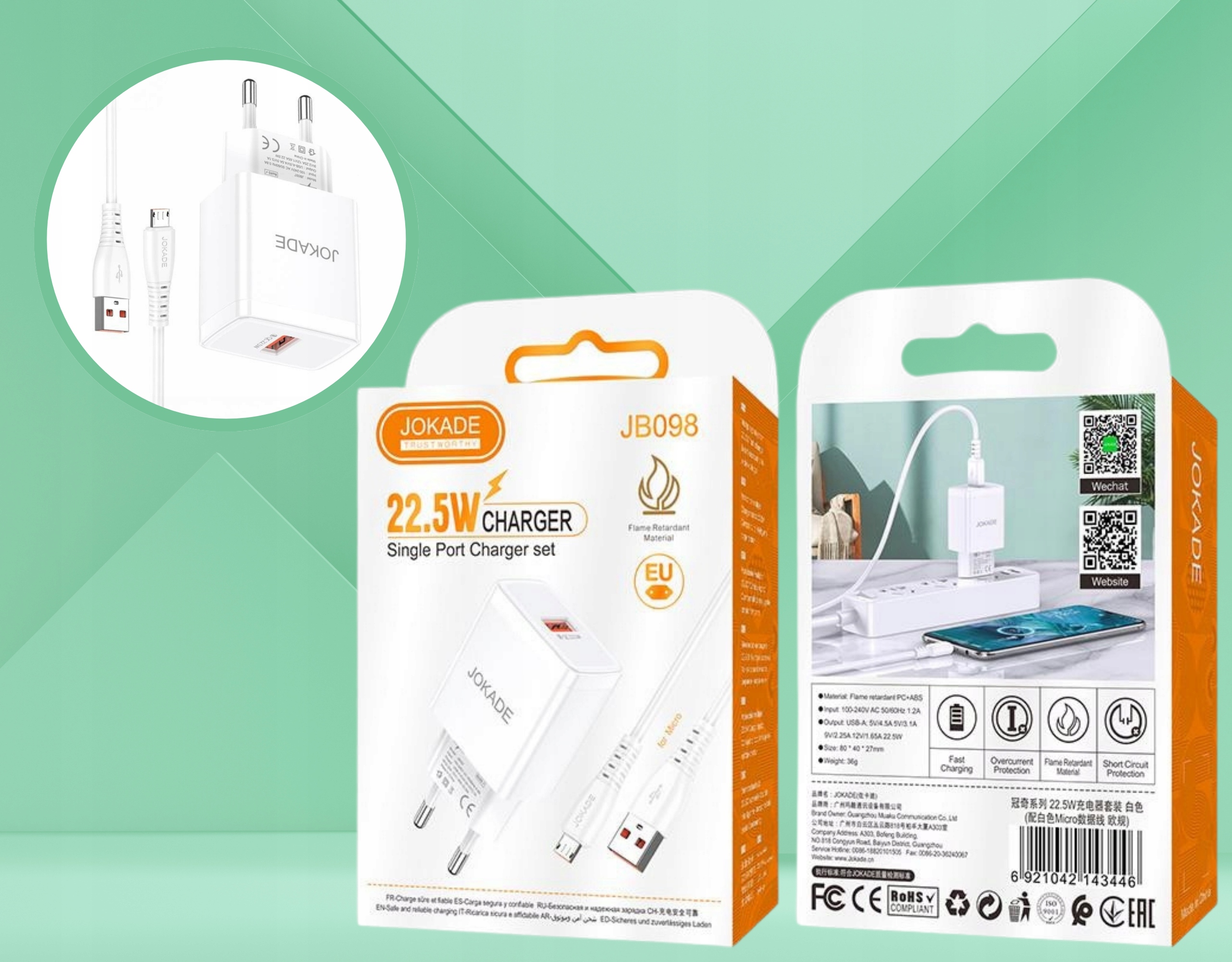 22,5W 1 x USB QC3.0 Зарядное устройство + 1M Кабель Micro USB Тип - B h1>