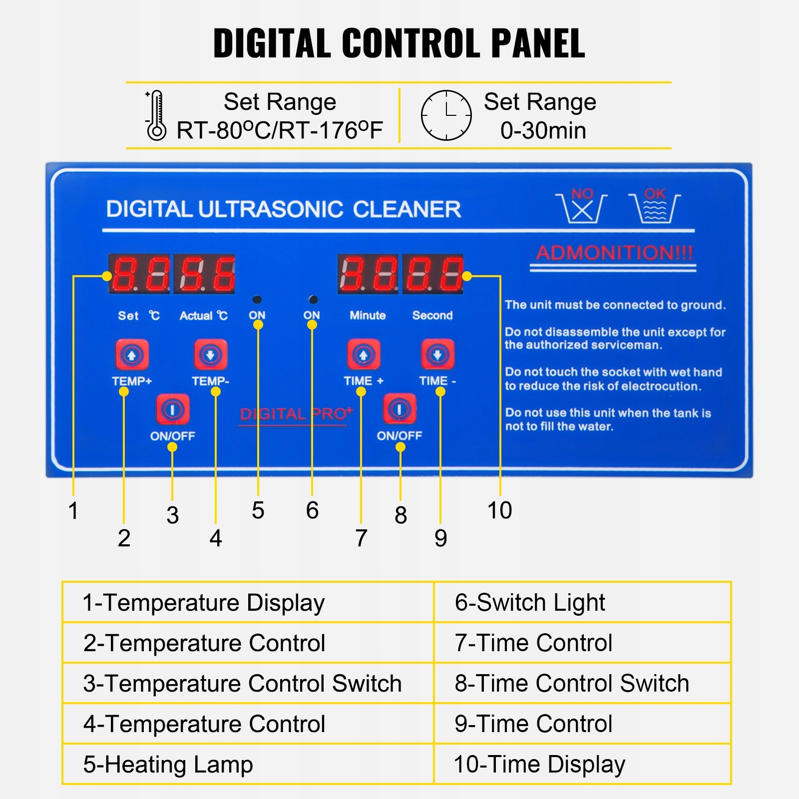 【ЦИФРОВАЯ ПАНЕЛЬ УПРАВЛЕНИЯ】 — Ультразвуковой очиститель имеет цифровую панель управления с регулируемым таймером (0–30 минут) и нагревом (RT-176°F / RT-80°C), отображаемыми на светодиодах. Функция нагрева эффективно смягчает и растворяет пятна масла и воска, улучшая эффект очистки.