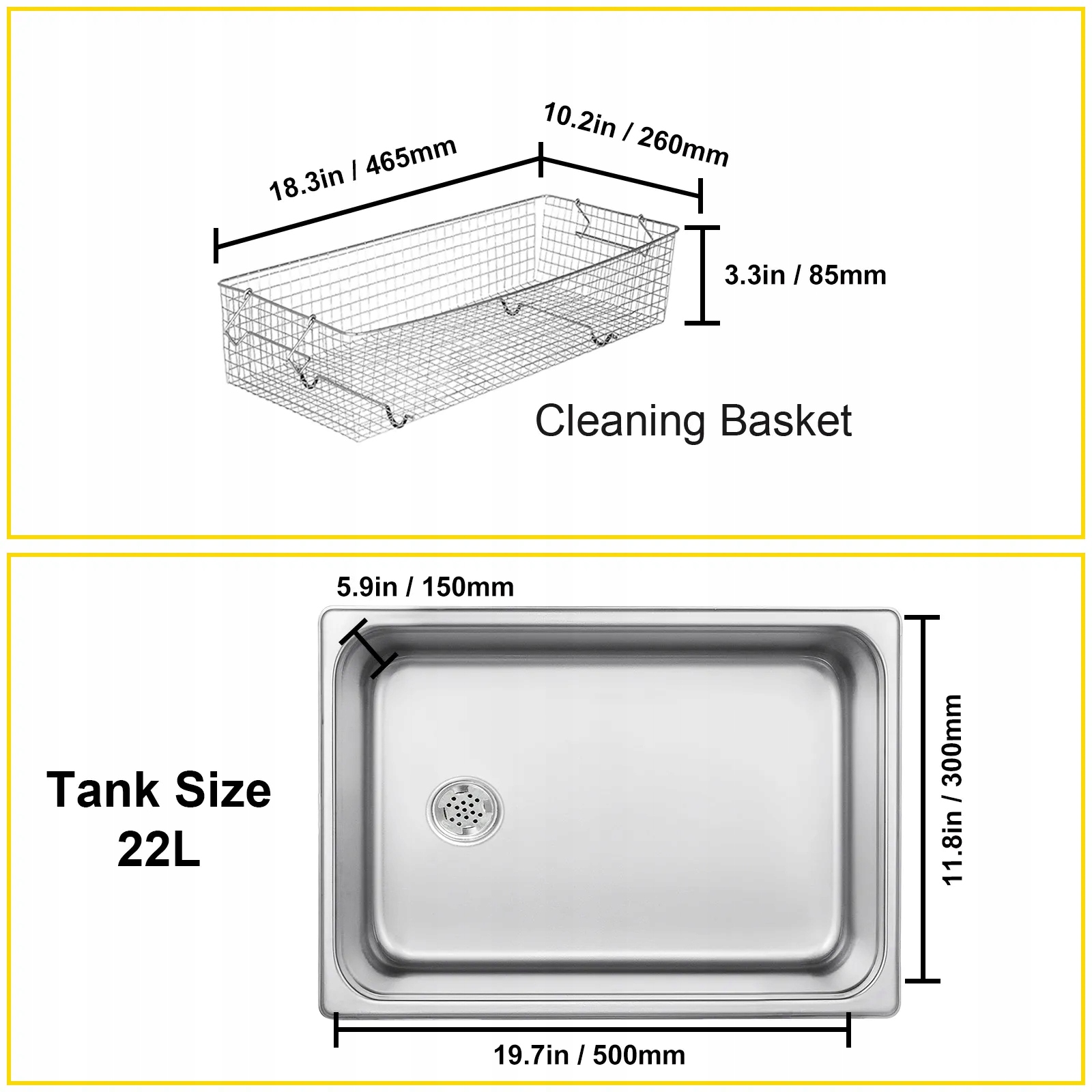 【МАТЕРИАЛ ПРЕМИУМ SUS304】 - Размер бака: 19-22 л; Мощность ультразвука: 480 Вт; Мощность нагрева: 600 Вт. Этот ультразвуковой очиститель изготовлен из прочной нержавеющей стали 304, что обеспечивает отсутствие утечек воды и длительный срок службы. Также доступна дополнительная корзина для уменьшения столкновений острых предметов с резервуаром.