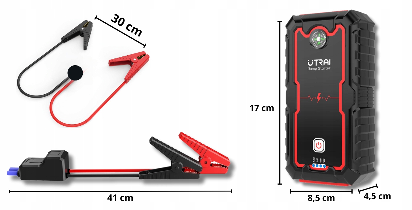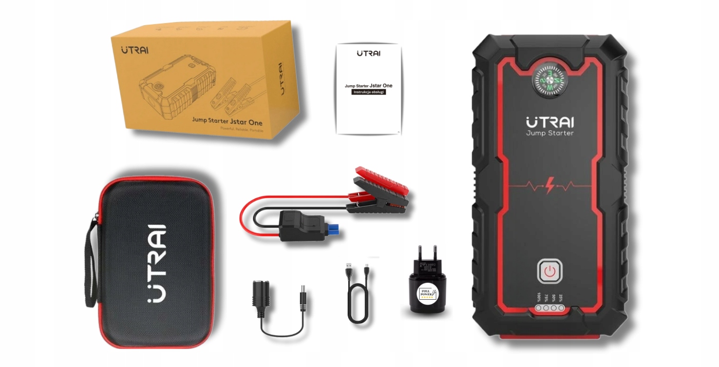 - Простота в использовании: UTRAI очень прост в использовании, и набор В комплект входят соединительные кабели, кабель USB-C, адаптер для прикуривателя, чехол, руководство на польском языке и зарядное устройство Full Power® QC 3.0, что еще больше облегчает его использование.