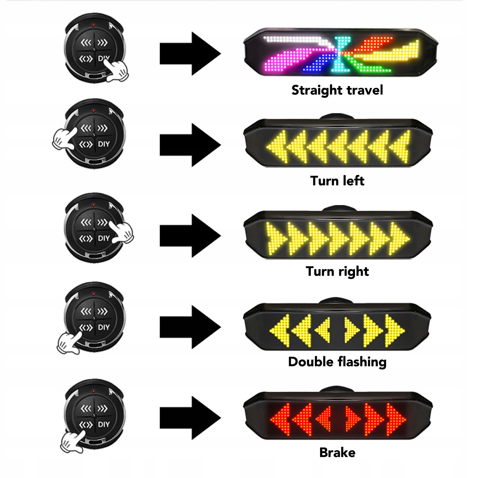 4. 4 ДИСТАНЦИОННЫХ РЕЖИМА: Пульт дистанционного управления, расположенный на ручке, позволяет велосипедистам удобно управлять велосипедом во время езды на велосипеде. Подходит для горных и шоссейных велосипедов. 4 режима, левый поворотник, правый поворотник, левый и правый свет, освещение проекта «сделай сам».