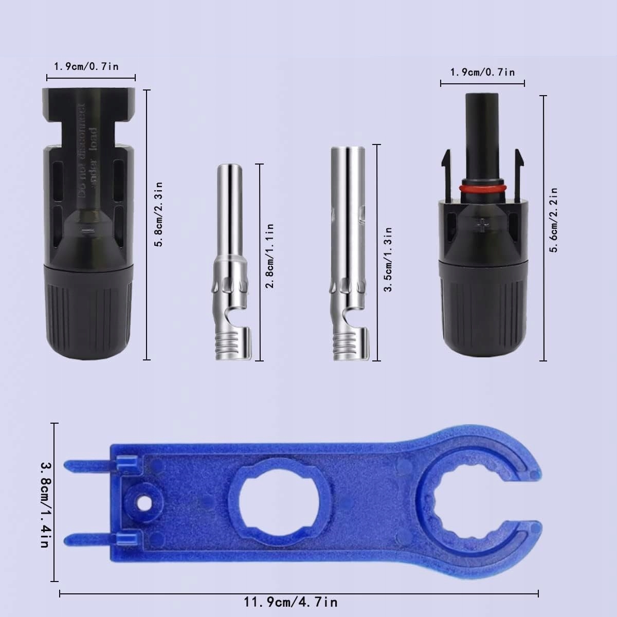 В комплект входят 12 пар солнечных вилок MC4 «папа/гнездо», 12 пар медных проводных клемм «папа» и «мама» и 2 многофункциональных ключа.