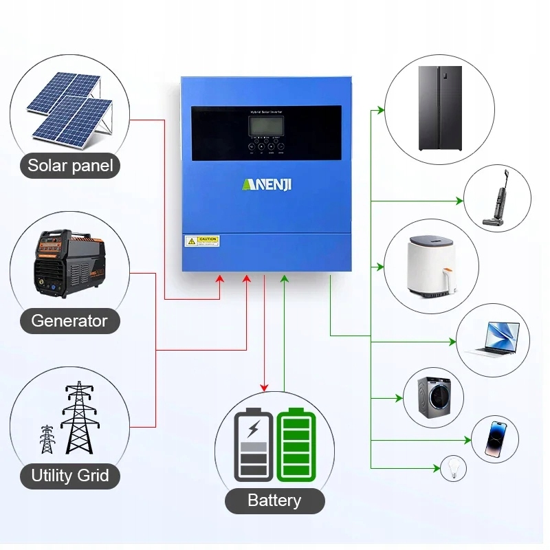 Например, дома мы можем использовать солнечную энергию, а когда она заканчивается, инвертор будет потреблять электроэнергию от подключенных, заряженных аккумуляторов или переключаться на питание от сети.