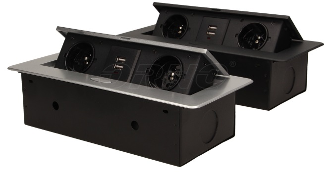 Описание продукта Набор из двух заземленных розеток, подключенных к зарядному устройству USB в корпусе, спрятанном в столешнице. Предназначен для установки внутри помещений на столах, столешницах и столах, как в вертикальном, так и в горизонтальном положении, обеспечивая доступ к электрическим розеткам.