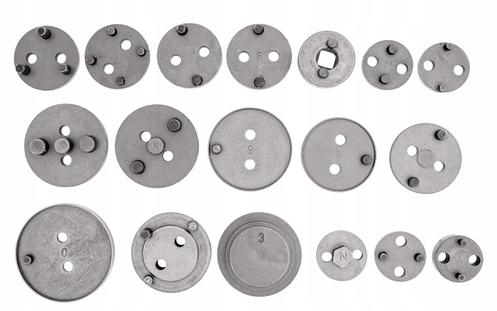 В комплект входят два пресса (правый и левый поворотный), две балки разной формы для прижима пресса к седлу суппорта и 18 адаптеров, адаптированных под размер тормозных поршней, используемых в большинстве легковых автомобилей, выпускаемых на европейском и азиатском рынках. .