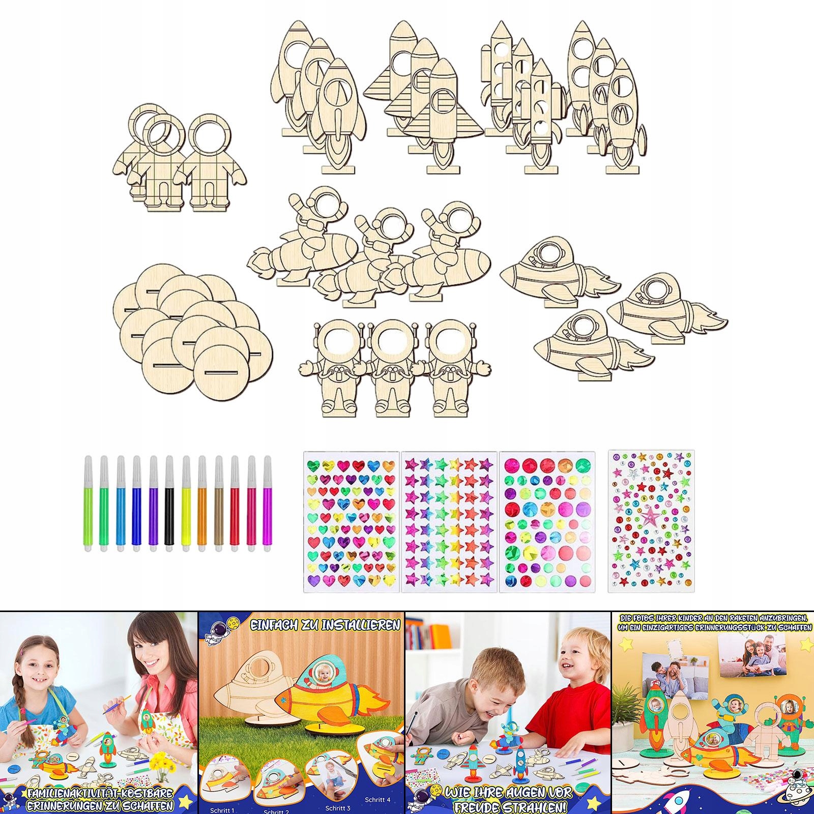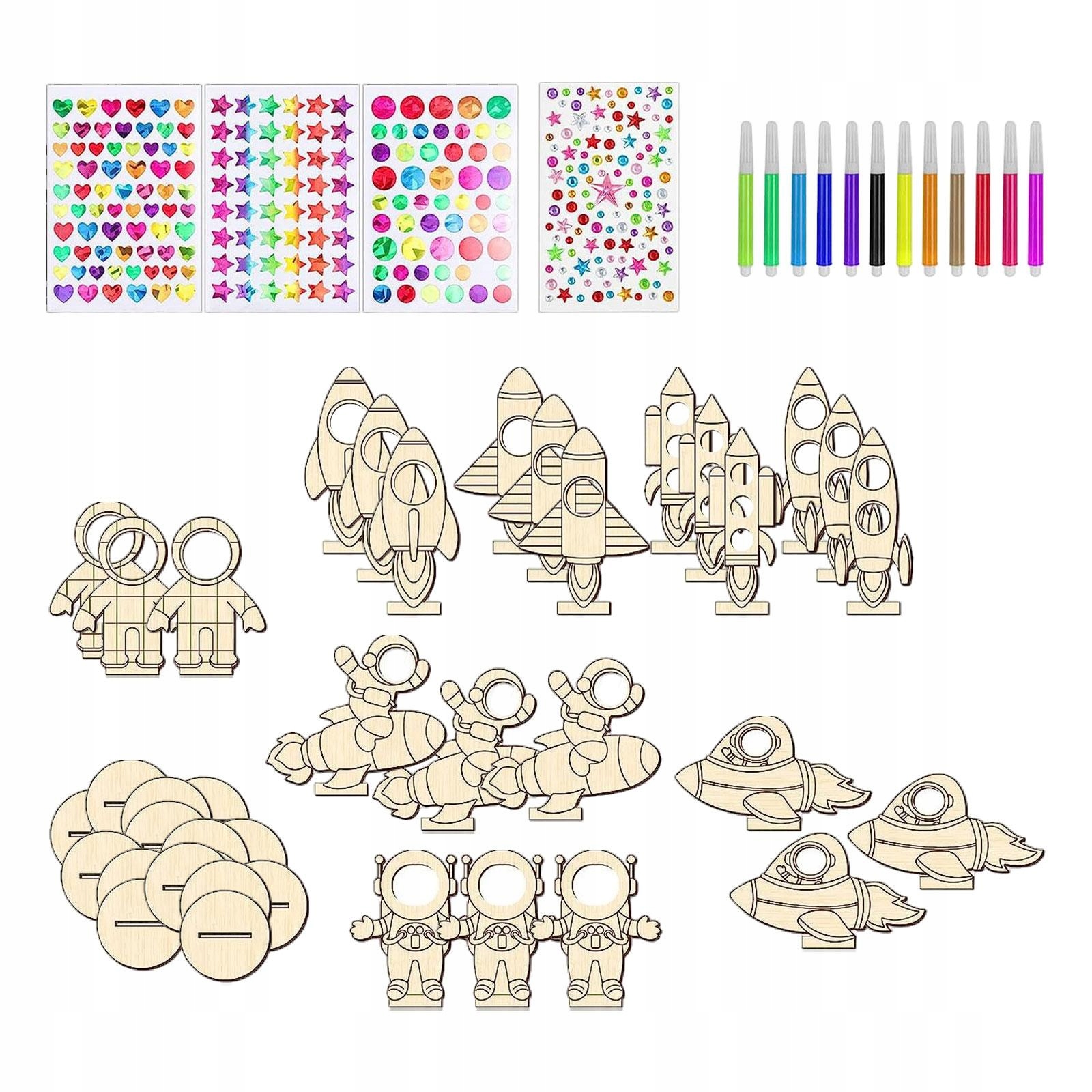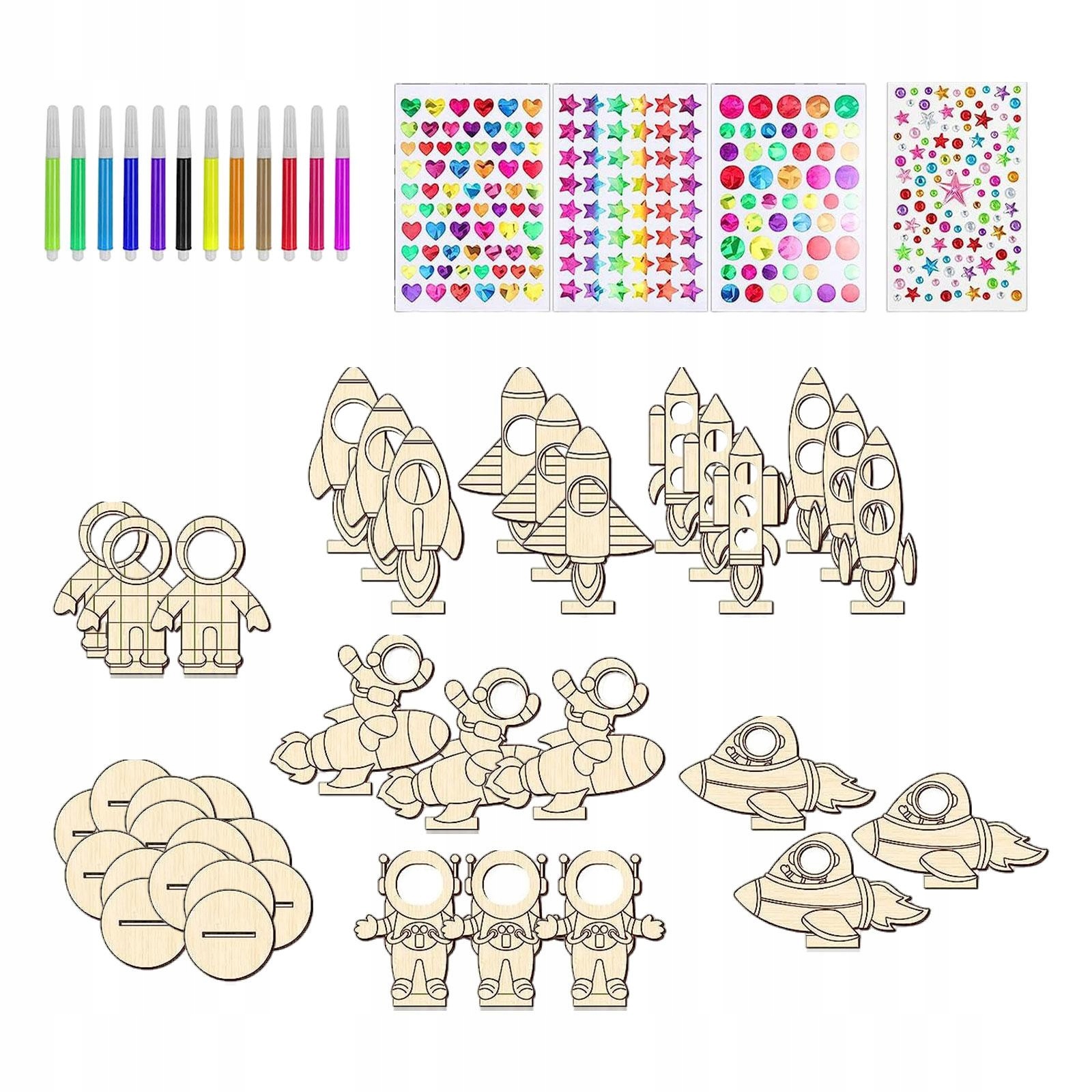 [Упаковка]: упаковка из 24 деревянных фигурок серии Space, 24 шт. деревянной основы, 3 листа 3D-наклеек, 1 шт. лист наклеек со стразами и 12 цветных акварельных маркеров для детей, вечеринок, домашних поделок или классных комнат.